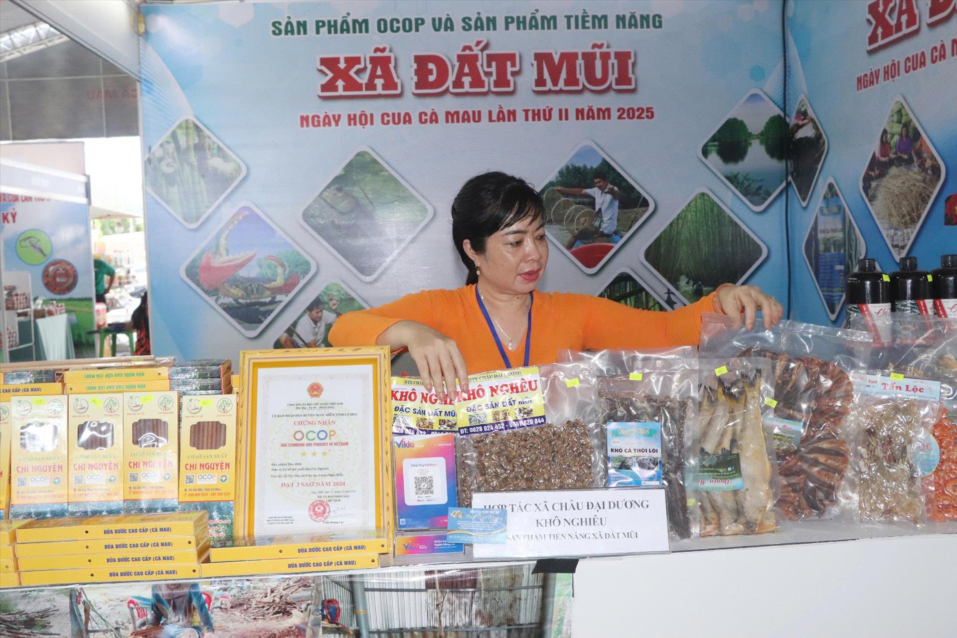 Gian chưng bày các sản phẩm OCOP và sản phẩm tiềm năng của xã Đất Mũi – Cà Mau tại ngày hội cua Cà Mau lần thứ 2 năm 2025. Ảnh: Tuấn Phi - TTXVN