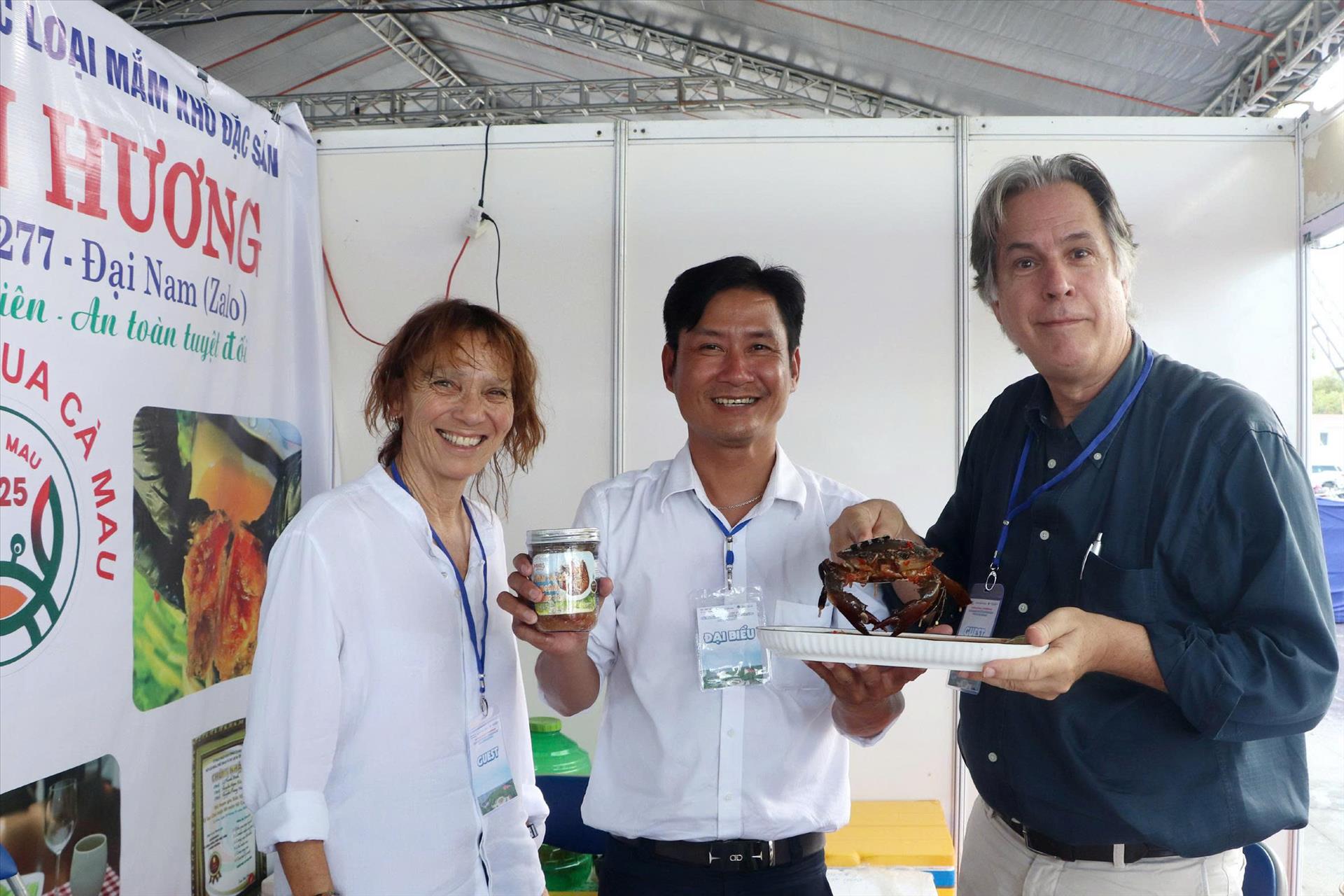Du khách nước ngoài thích thú với các sản phẩm tại ngày hội cua Cà Mau lần thứ 2 năm 2025. Ảnh: Tuấn Phi - TTXVN