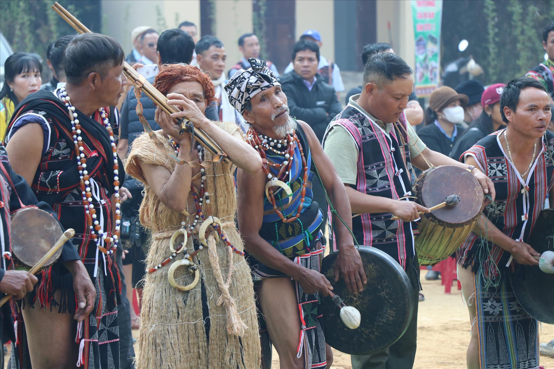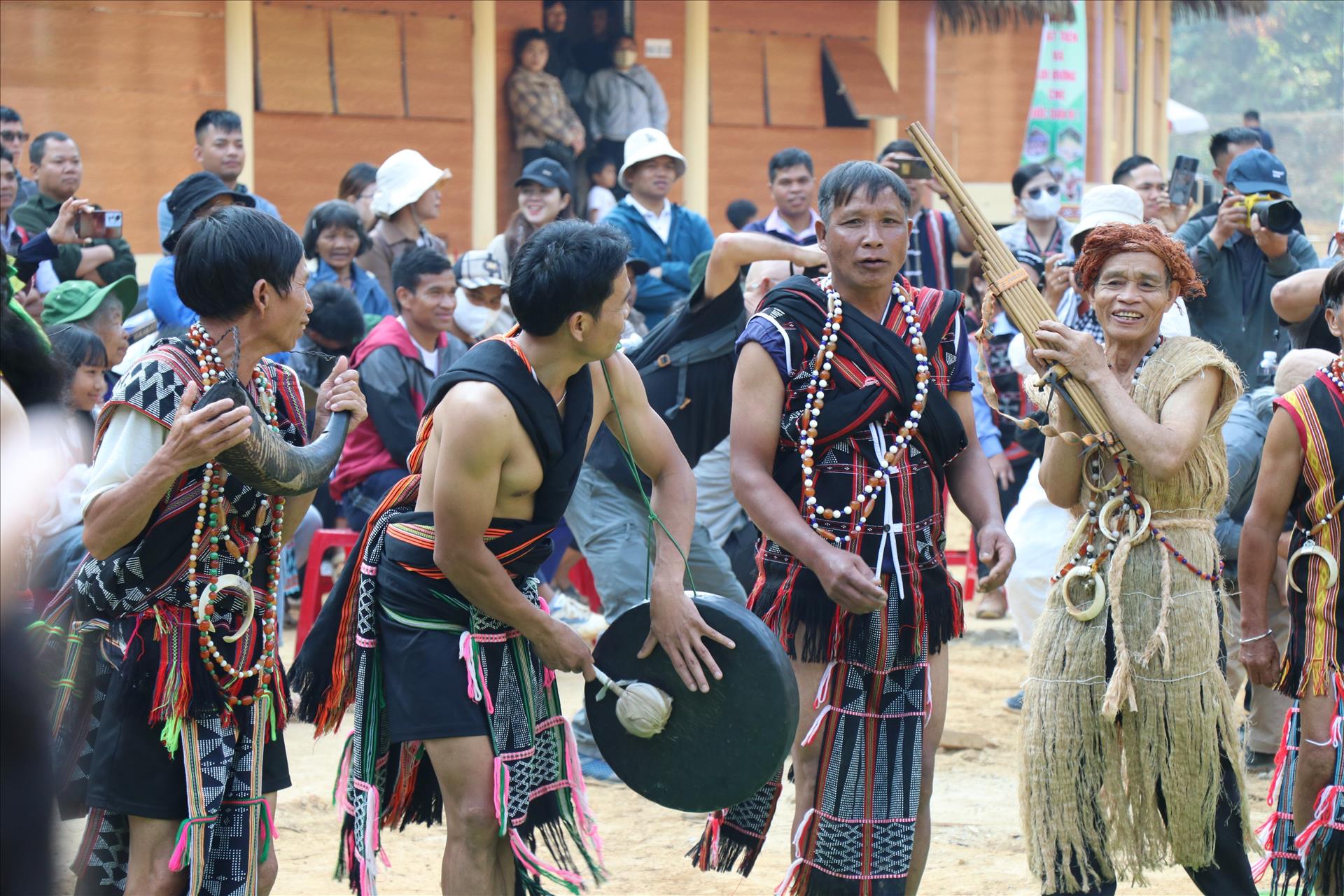 Người đồng bào Cơ Tu trình diễn cồng chiêng tại Lễ hội khai năm tạ ơn rừng (xã Hùng Sơn, thành phố Đà Nẵng). Ảnh: Khoa Chương - TTXVN