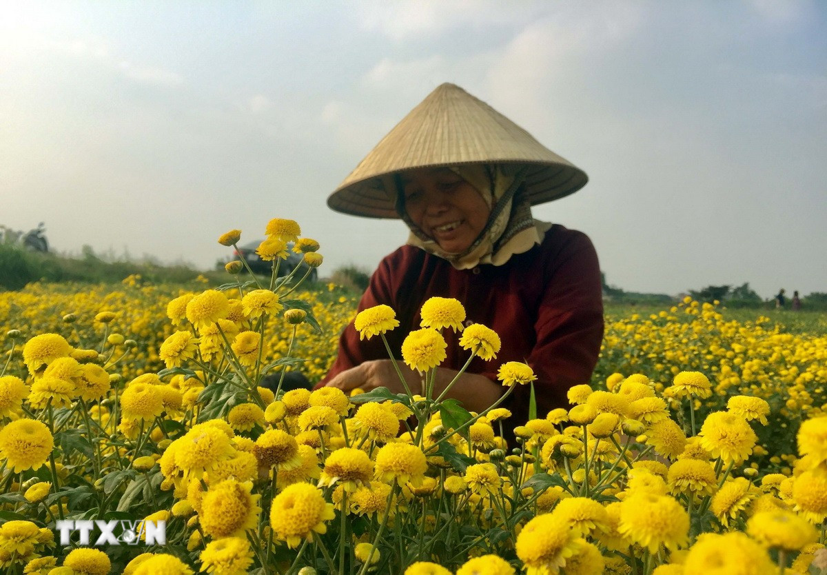 Thu hoạch hoa cúc chi tại làng Nghĩa Trai. Ảnh: Phạm Kiên/TTXVN