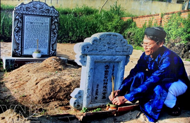 Ông Phạm Thoại Tuyền bên ngôi mộ gió ông Chánh đội trưởng thủy quân suất đội Phạm Hữu Nhật.