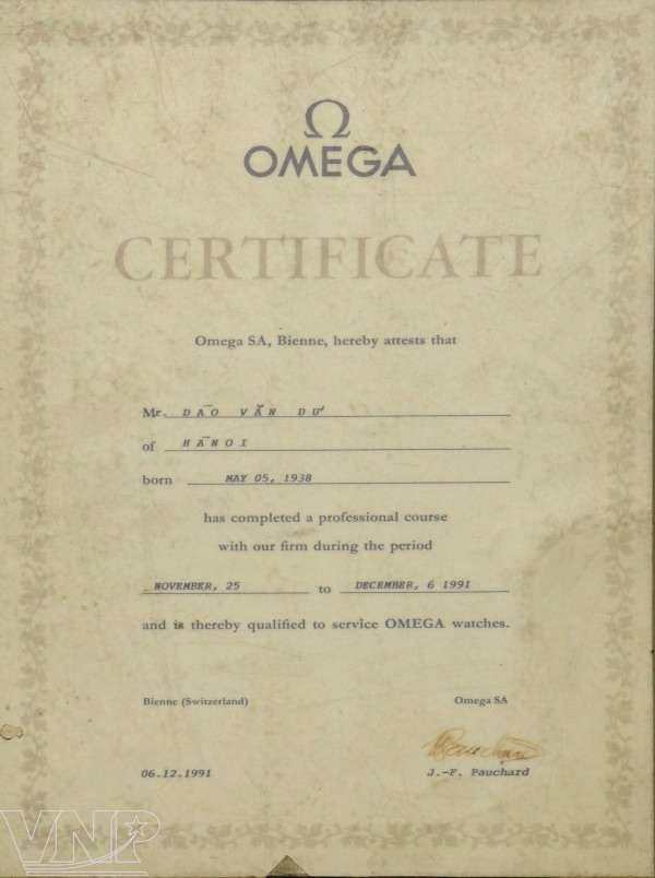 ![]() Ông Đào Văn Dư nay đã ở tuổi 73 nhưng vẫn cặm cụi bên bàn làm việc sửa chữa những chiếc đồng hồ. ![]() Đôi bàn tay của ông vẫn khéo léo với từng chi tiết nhỏ nhất của chiếc đồng hồ. ![]() Đôi mắt của ông vẫn còn tinh tường đề có thể “bắt bệnh” từng loại đồng hồ. ![]() Ông Dư trao đổi kinh nghiệm sửa chữa đồng hồ với người con trai Đào Vũ Hải. ![]() Ông Dư sửa chữa chi tiết máy của đồng hồ. ![]() Những chiếc đồng hồ có tuổi thọ hơn 100 năm vẫn chạy tốt khi được ông Dư bảo dưỡng. ![]() Ông Dư nhận tấm bằng tốt nghiệp khóa học thực hành ở Thụy Sỹ từ tay ông Porchat, Thị trưởng thành phố Etat de Neuchâtel (1980). ![]() Ông Dư nhận tấm bằng Diploma tại Nhà máy đồng hồ Rado Thụy Sỹ (1991). ![]() Một trong những tấm bằng mà các hàng đồng hồ nổi tiếng thế giới chứng nhận về trình độ sửa chữa đồng hồ của ông Dư. |