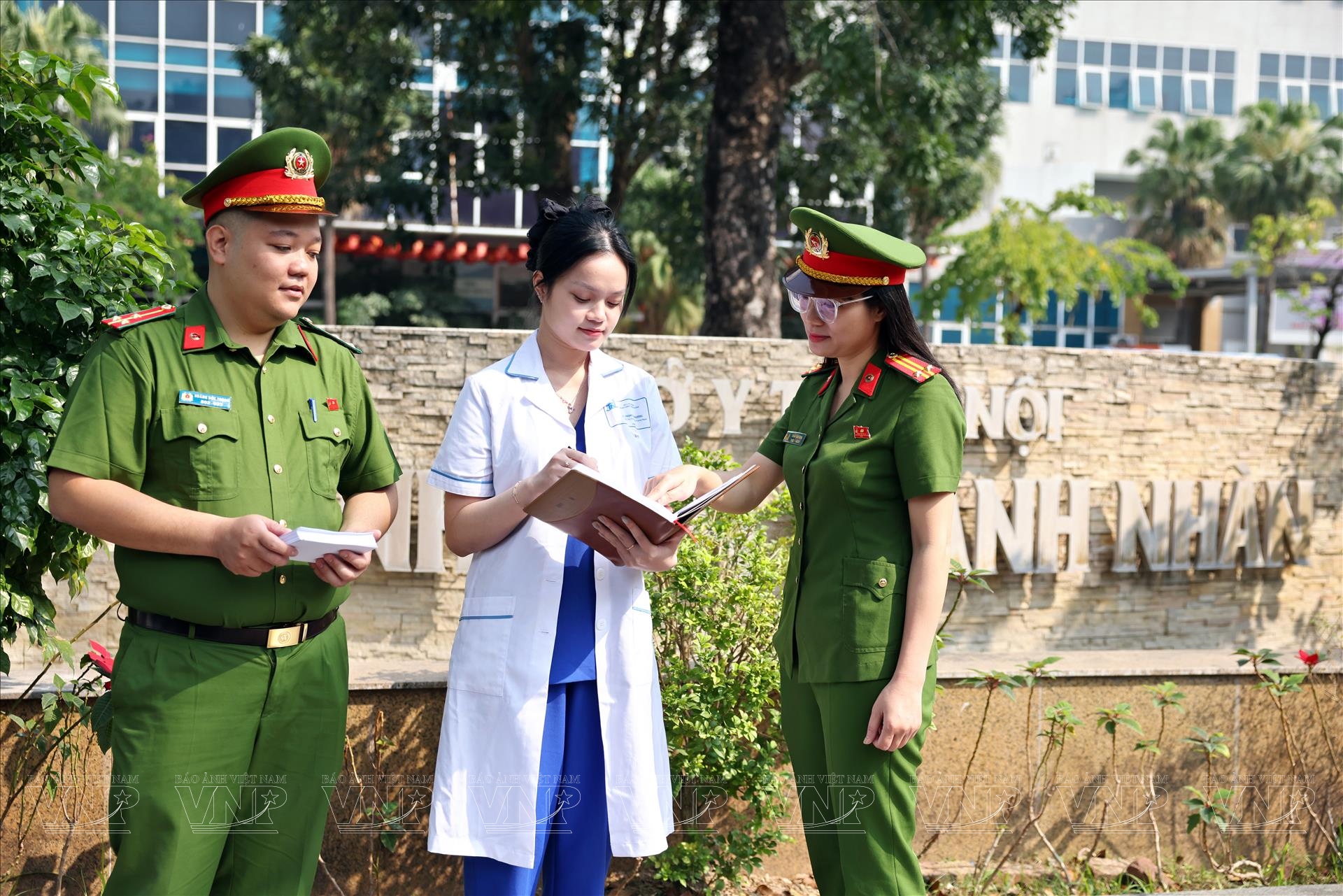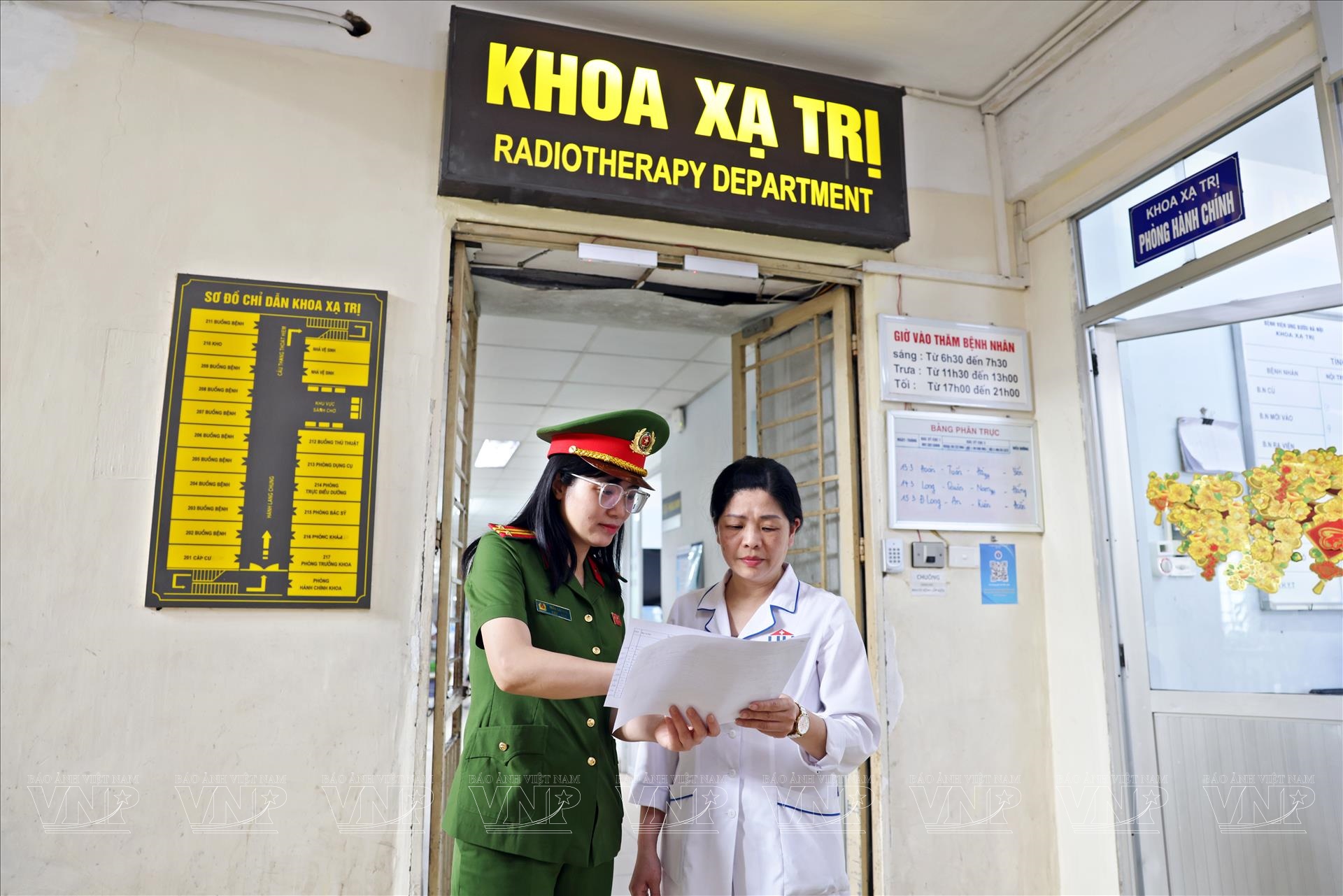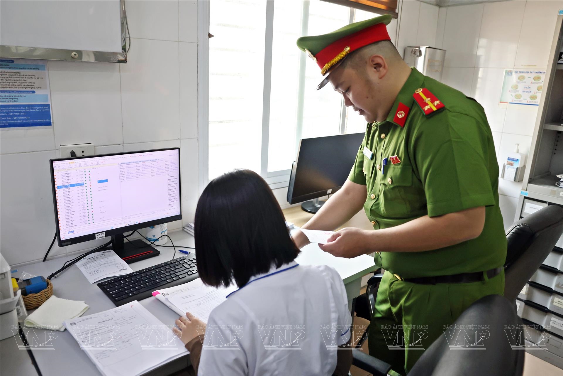 Trung tá Trần Sao Hoa, cán bộ công an phường Bạch Mai, trao đổi với nhân viên y tế Bệnh viện Ung Bướu Hà Nội để rà soát số lượng bệnh nhân điều trị dài ngày cần hỗ trợ làm công tác bầu cử. Ảnh: Công Đạt/Báo ảnh Việt Nam