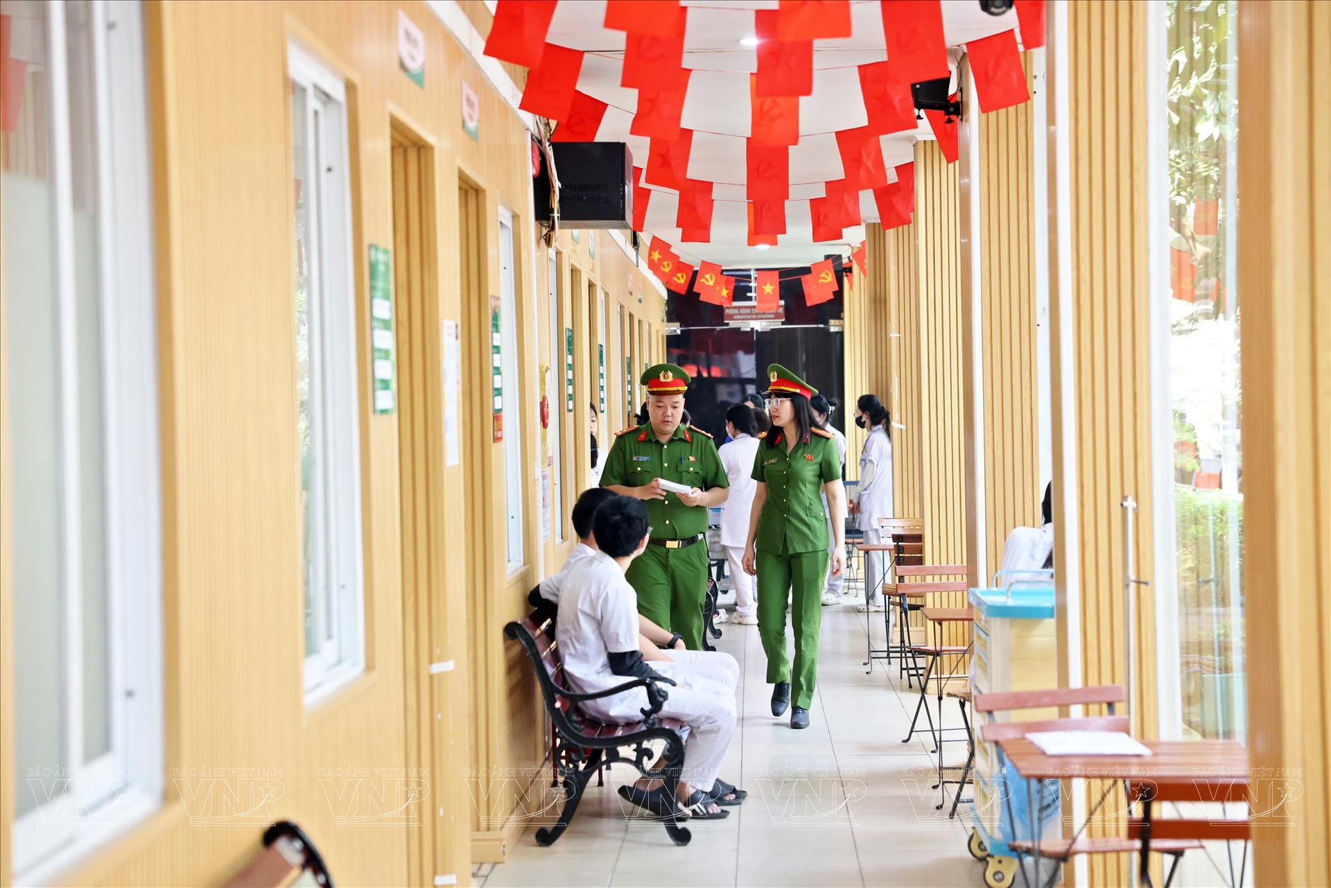 Thượng úy Hoàng Đức Trọng, cán bộ công an phường Bạch Mai, phối hợp với nhân viên y tế Bệnh viện Ung Bướu Hà Nội đối chiếu thông tin bệnh nhân để bảo đảm việc phát thẻ cử tri đúng đối tượng. Ảnh: Công Đạt/Báo ảnh Việt Nam