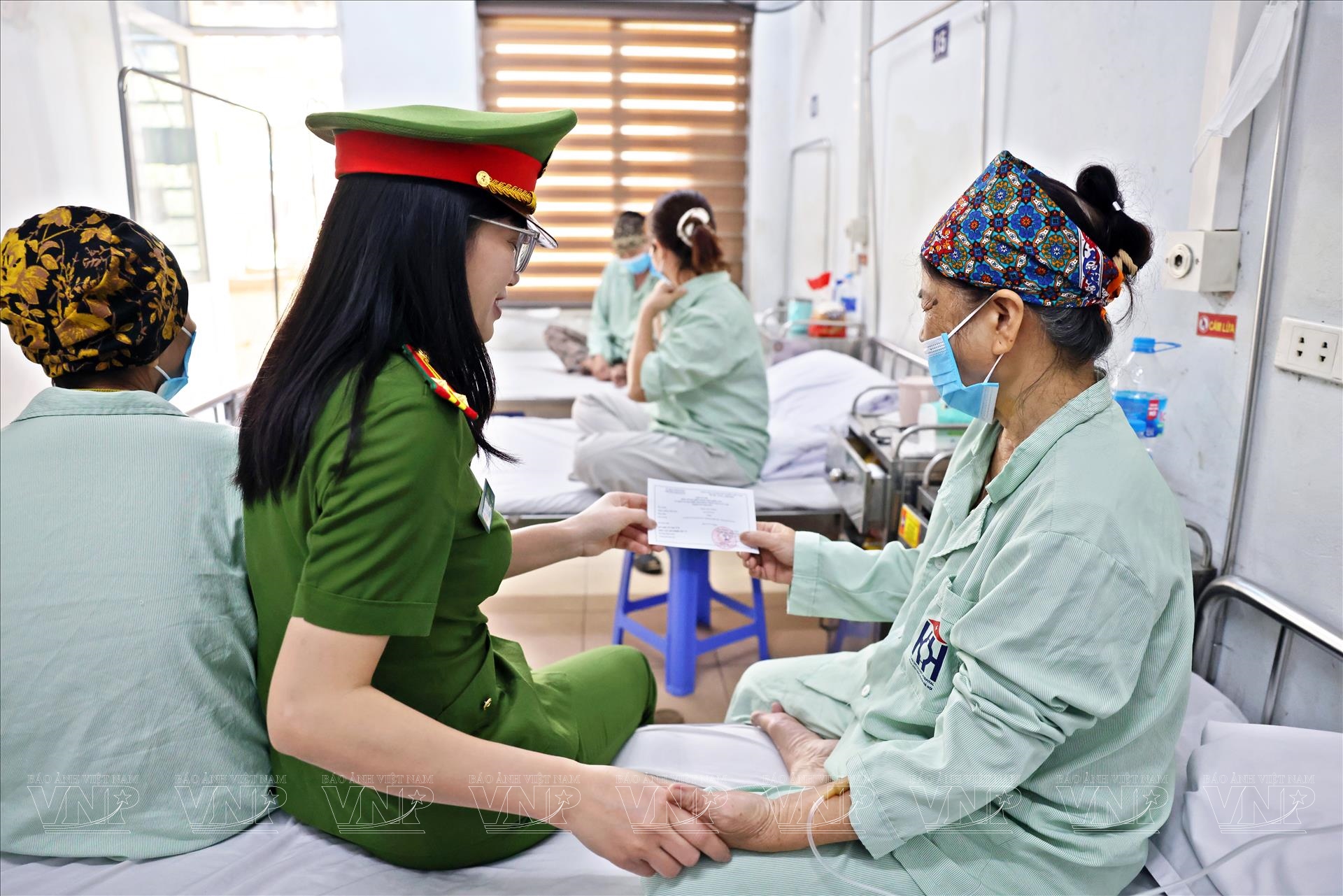 Các bệnh nhân đang nằm điều tại bệnh viện rất vui mừng khi được Trung tá Trần Sao Hoa, cán bộ công an phường Bạch Mai, đến tận giường bệnh trao thẻ cử tri và hướng dẫn cách thức bầu cử. Ảnh: Công Đạt/Báo ảnh Việt Nam
