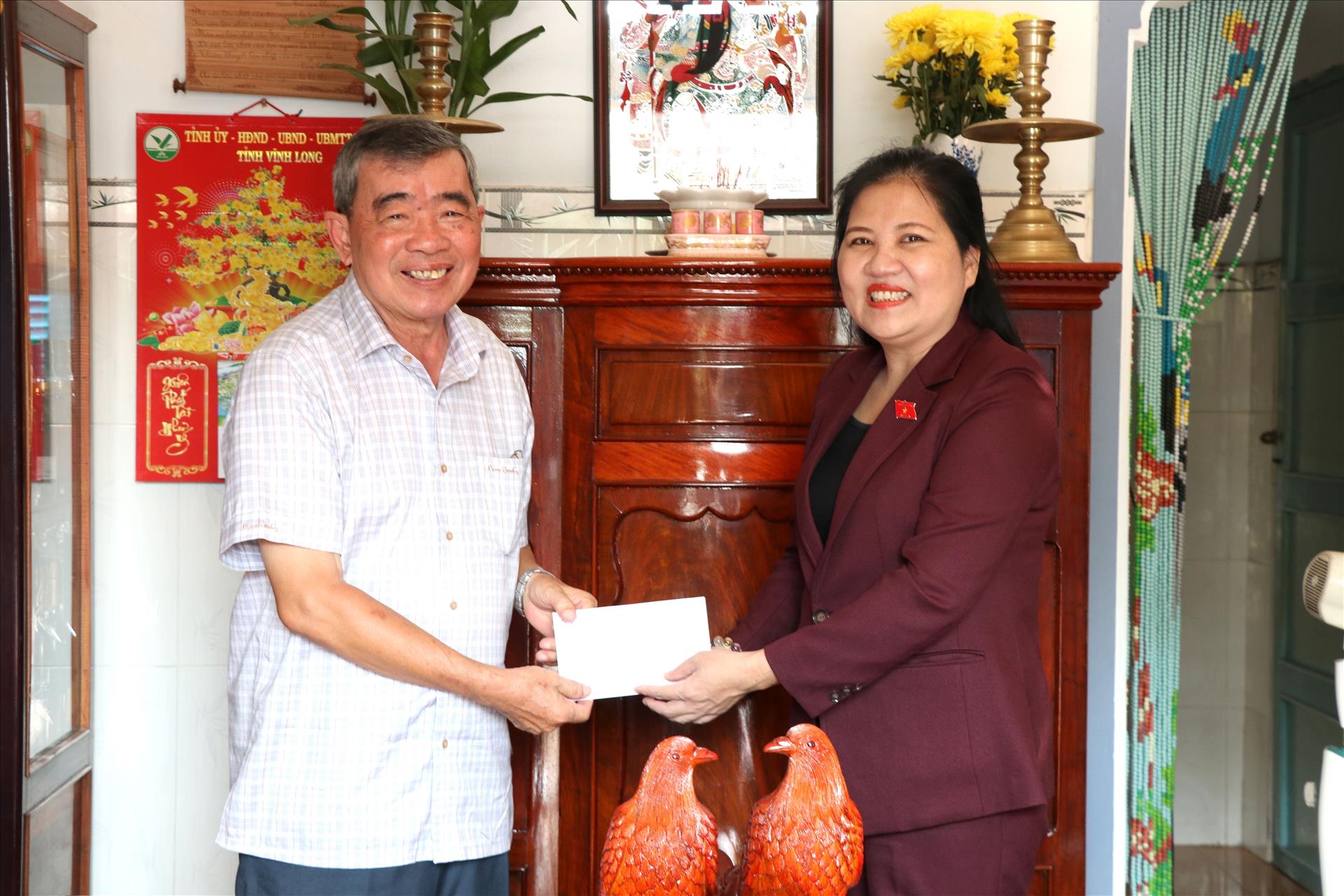 Bà Đinh Thị Phương Lan, Phó Chủ tịch Hội đồng Dân tộc thăm, tặng quà ông Huỳnh Phước Long, nguyên Phó Chủ tịch thường trực Hội đồng Dân tộc của Quốc hội. Ảnh: Thanh Hòa- TTXVN