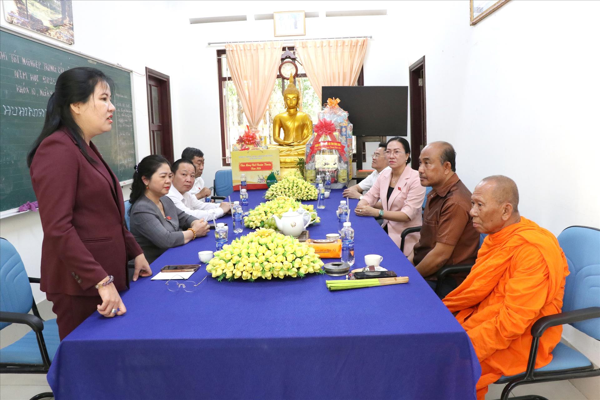 Bà Đinh Thị Phương Lan, Phó Chủ tịch Hội đồng Dân tộc đến thăm và phát biểu tại Trường Trung cấp Pali-Khmer. Ảnh: Thahh Hòa- TTXVN
