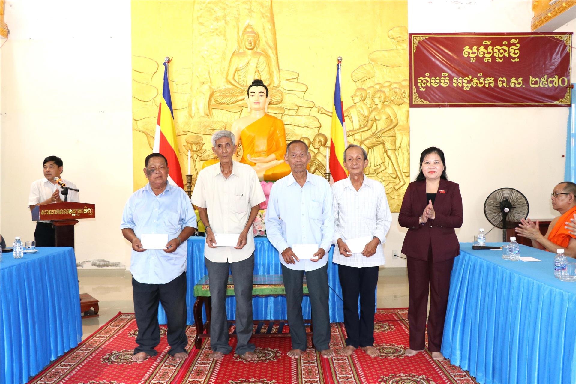 Bà Đinh Thị Phương Lan, Phó Chủ tịch Hội đồng Dân tộc, trao quà Tết cho Hội Đoàn kết sư sãi yêu nước tỉnh Vĩnh Long. Ảnh: Thanh Hòa- TTXVN