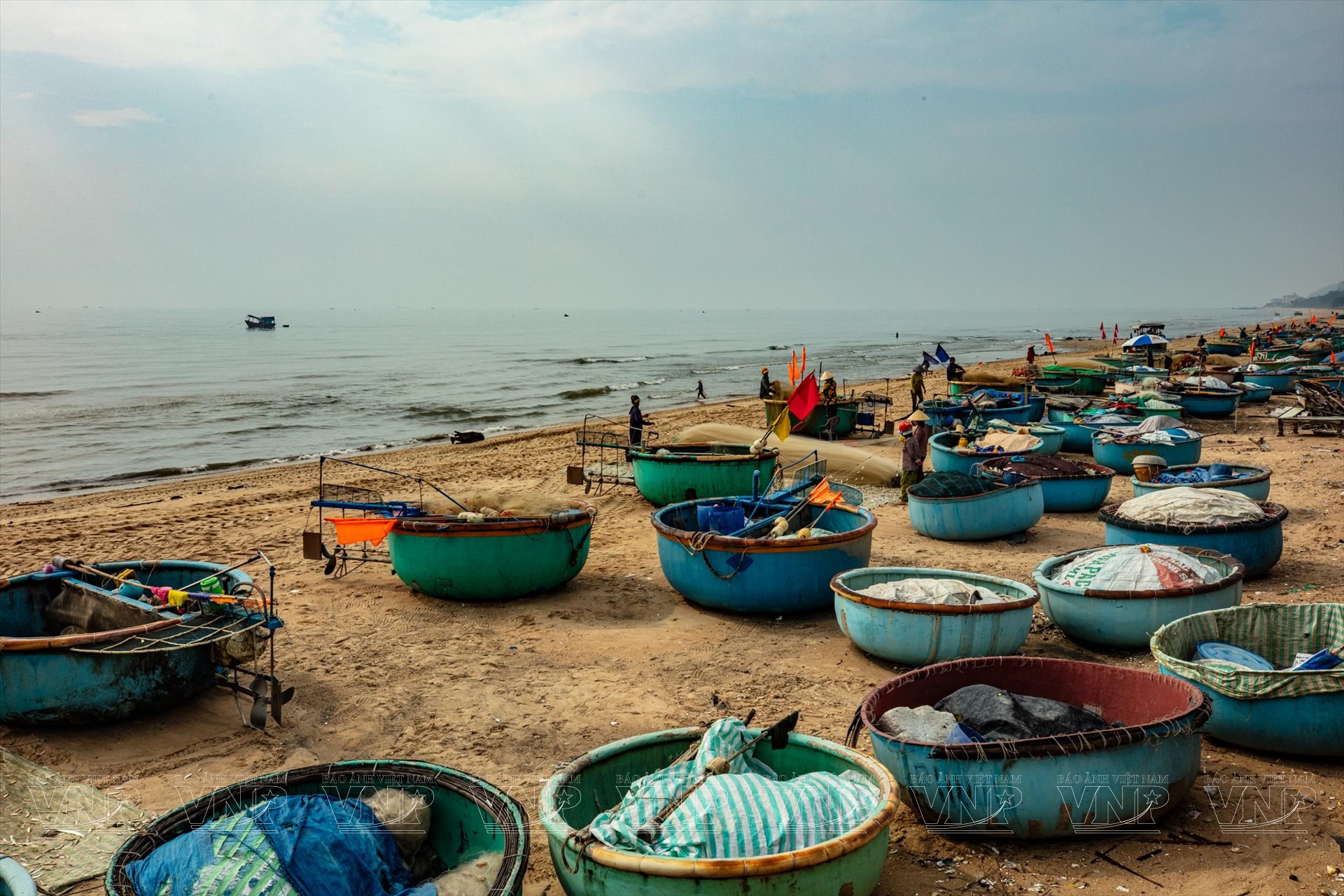 Những chiếc thúng chai đánh bắt hải sản gần bờ của ngư dân làng chài Phước Hải trở về sau một đêm vươn khơi, mang theo thành quả lao động của biển.