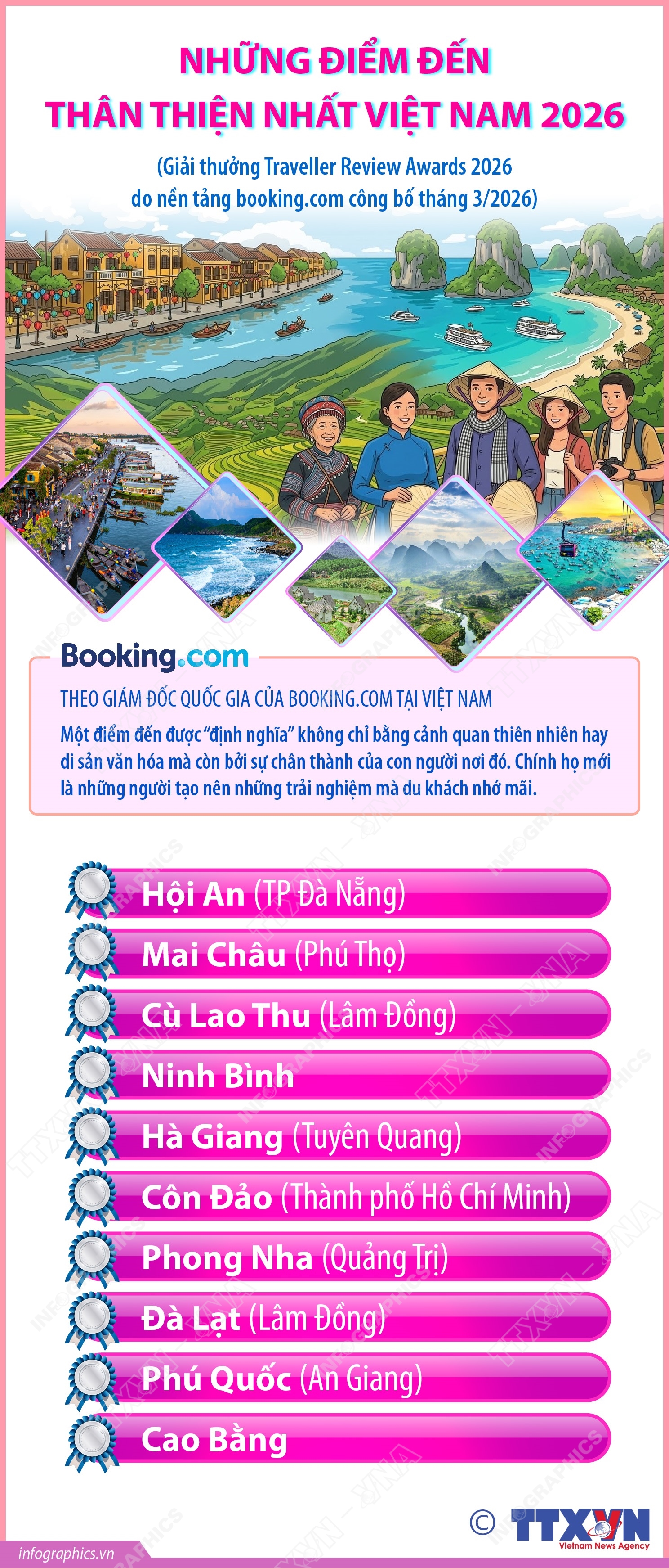 Theo kết quả Giải thưởng Traveller Review Awards 2026 do nền tảng booking.com công bố đầu tháng 3/2026, Hội An (TP Đà Nẵng) là điểm đến thân thiện nhất Việt Nam trong năm 2026, tiếp sau là Mai Châu (Phú Thọ), Cù Lao Thu (Lâm Đồng), Ninh Bình, Hà Giang (Tuyên Quang)…