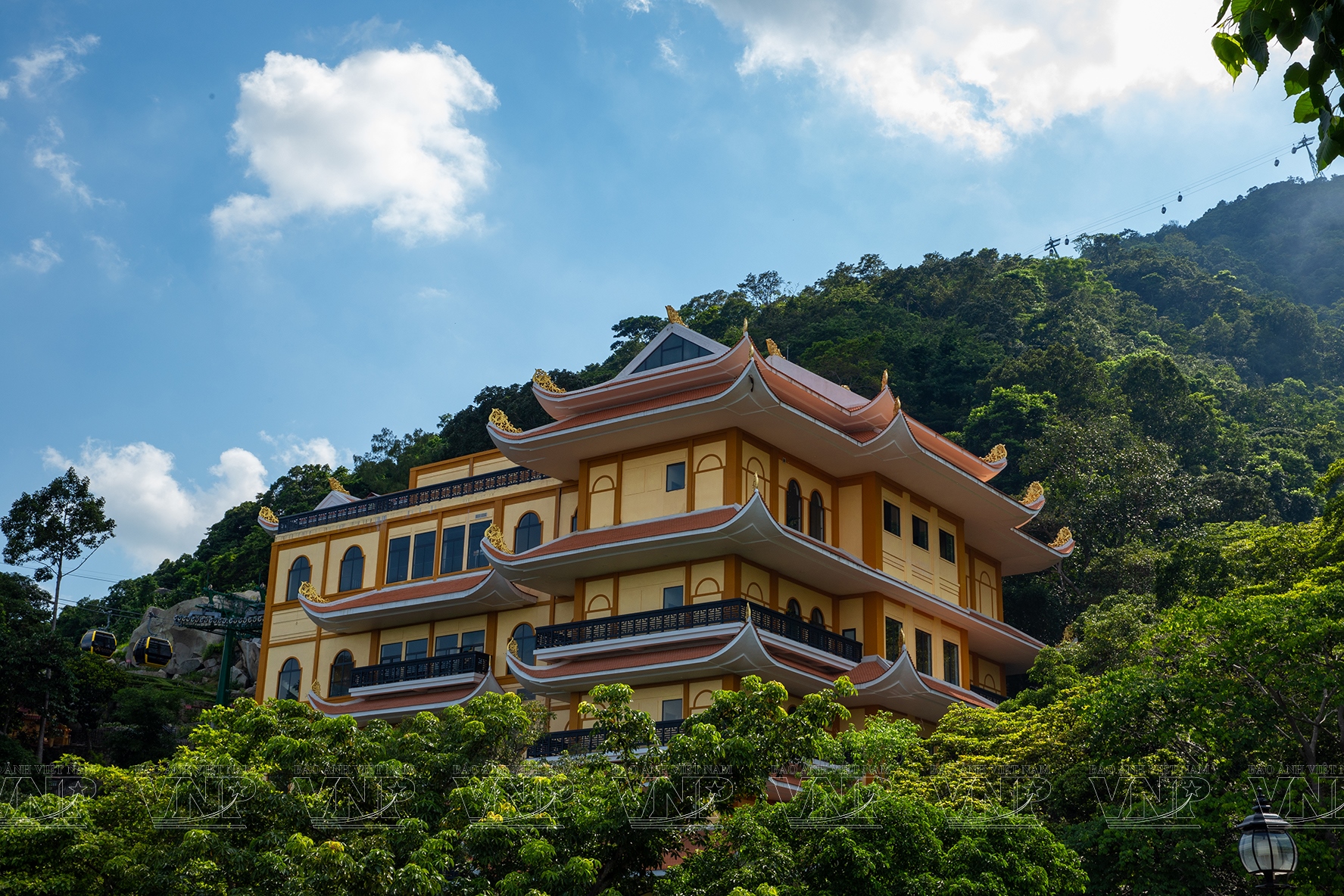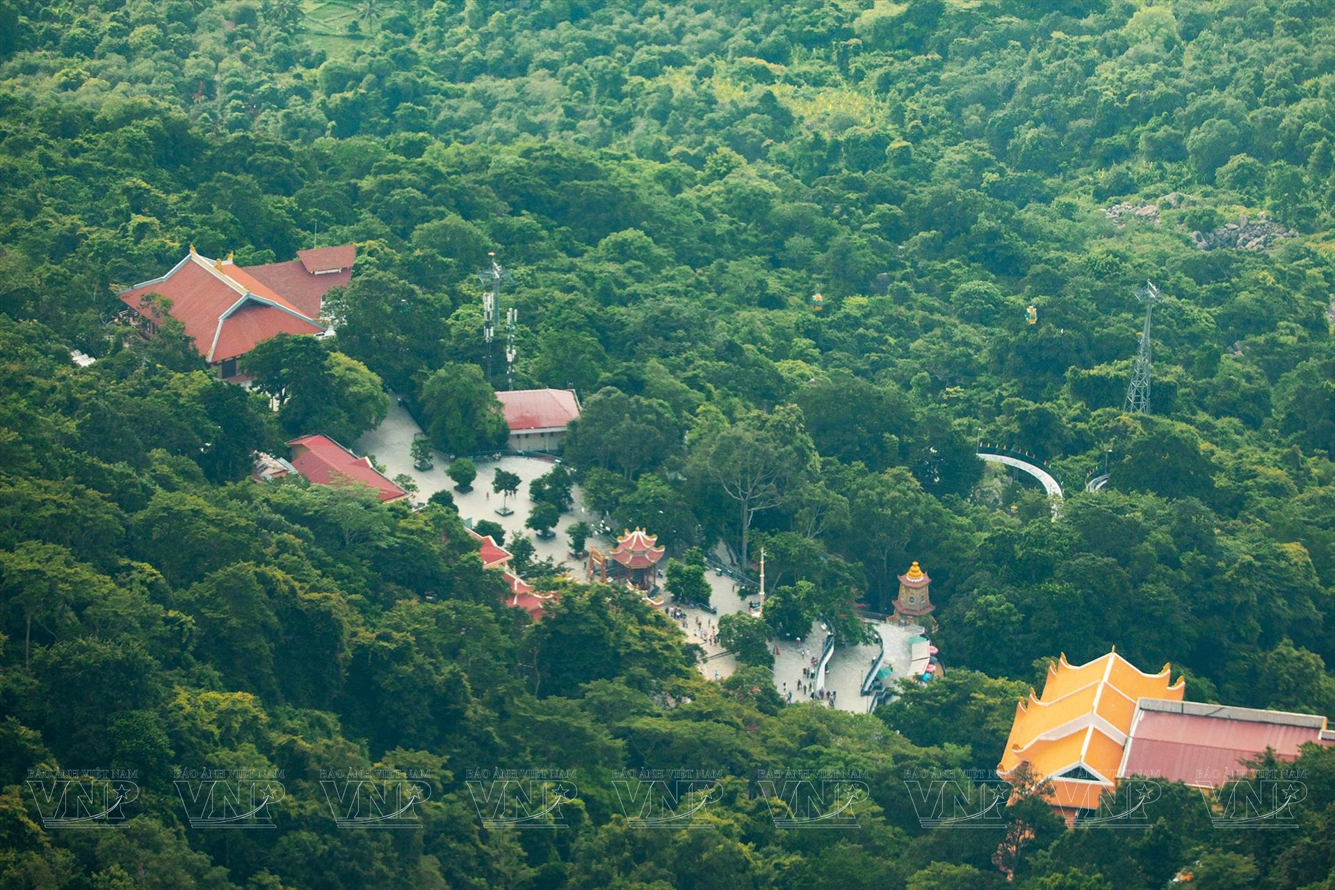 Từ tuabin cáp treo có thể ngắm nhìn quần thể các ngồi chùa ẩn hiện dưới rừng cây trên sườn núi.