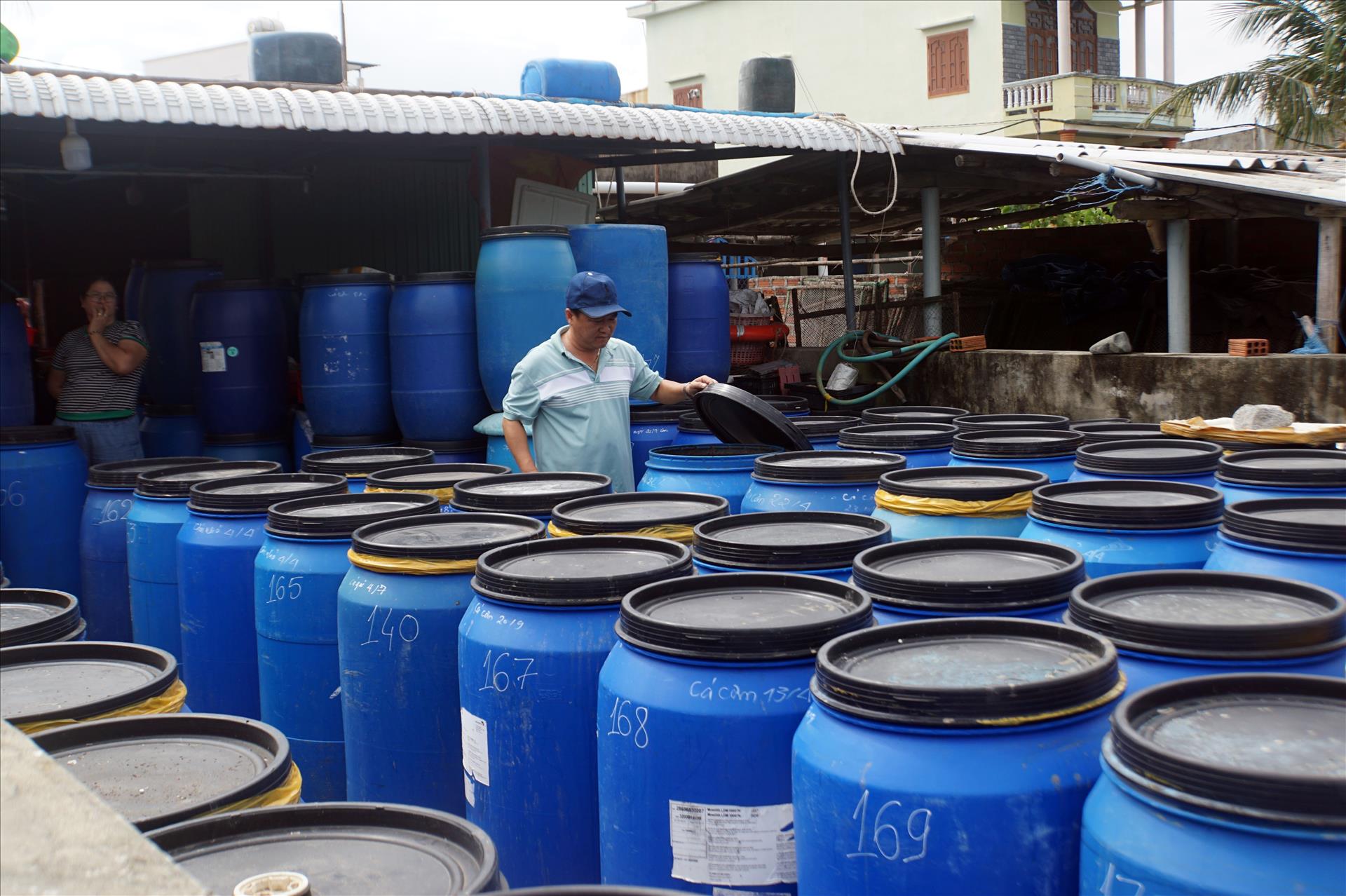 Người dân làng nước mắm Đề Ghi và những thùng mắm chuẩn bị cho thị trường tết. Ảnh: Trịnh Bang Nhiệm - TTXVN