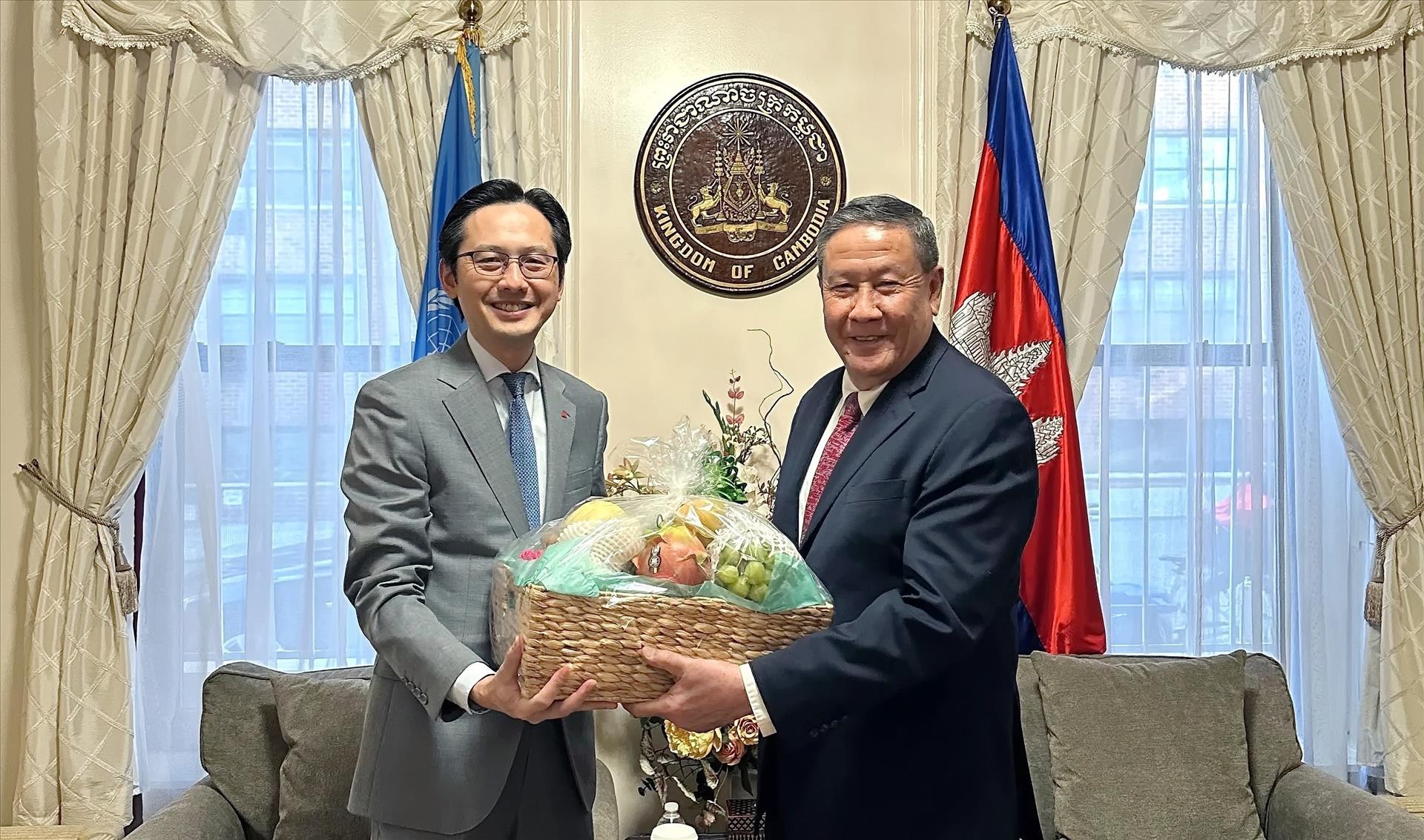 Đại sứ Chhea Keo bày tỏ phấn khởi về sự phát triển tốt đẹp của quan hệ láng giềng tốt đẹp, hữu nghị truyền thống, hợp tác toàn diện, bền vững lâu dài Campuchia - Việt Nam thời gian qua, tin tưởng quan hệ song phương sẽ tiếp tục được củng cố hơn nữa, mang lại lợi ích thiết thực cho nhân dân hai nước. Trưởng Phái đoàn Campuchia nhất trí phối hợp thúc đẩy hơn nữa hợp tác giữa hai nước trong các vấn đề quốc tế và khu vực cùng quan tâm, nhất là LHQ và trong khuôn khổ Ủy ban ASEAN tại New York trong thời gian tới./.