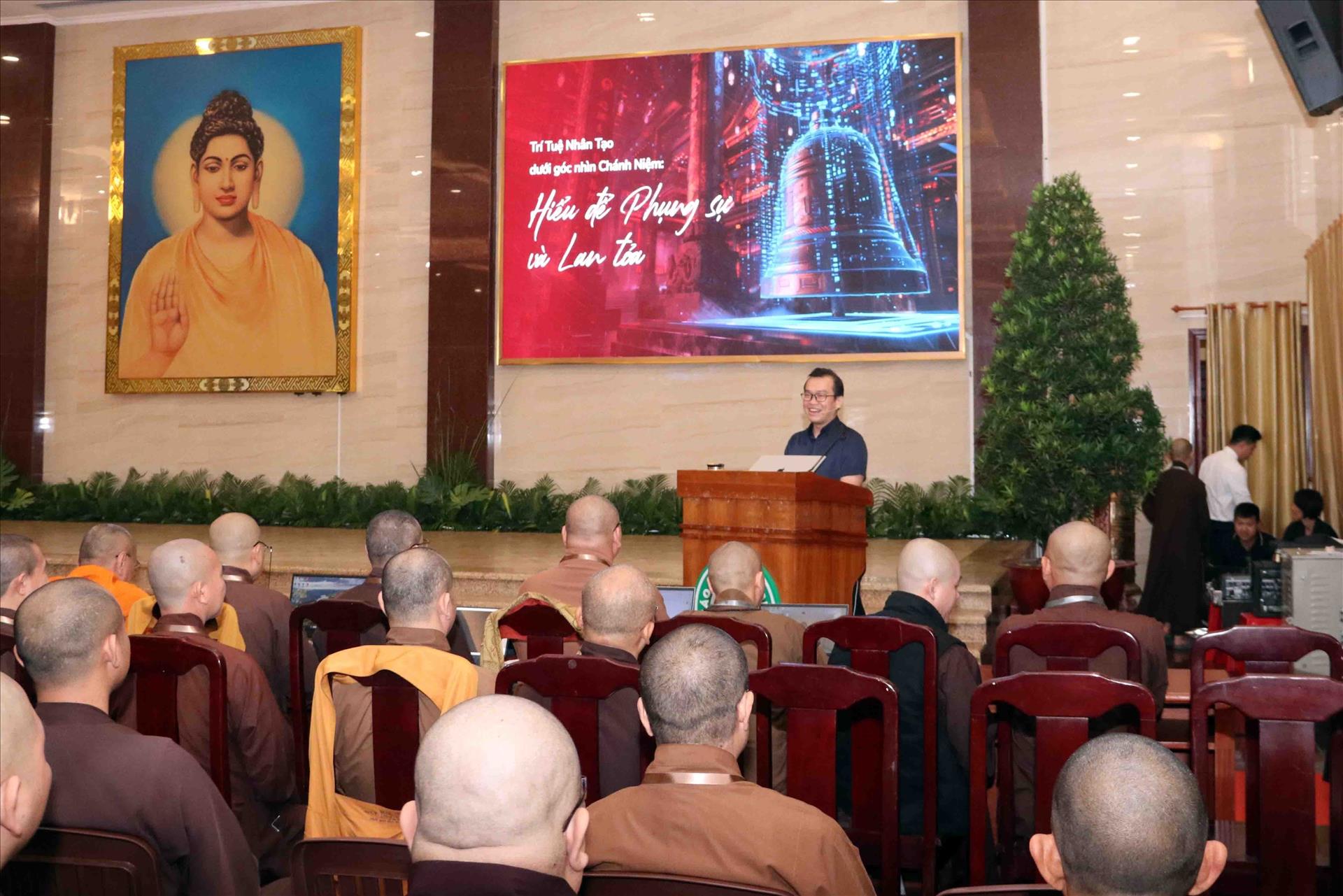 Trong hai ngày, các học viên được giới thiệu những khái niệm cơ bản về trí tuệ nhân tạo và chuyển đổi số; lý thuyết và thực hành ứng dụng AI vào đời sống xã hội, công tác quản trị dữ liệu, hoằng pháp hiện đại…/.