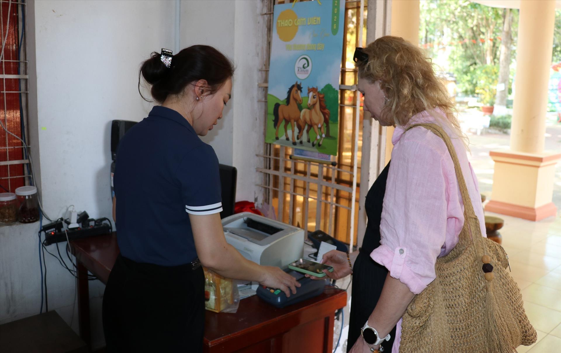 Khách nước ngoài quét mã QR thanh toán tại điểm du lịch tiêu biểu Trung tâm Nuôi trồng Nghiên cứu Chế biến Dược liệu Cục hậu cần Quân khu 9 (Trại rắn Đồng Tâm), ở xã Kim Sơn, tỉnh Đồng Tháp. Ảnh: Hữu Chí - TTXVN