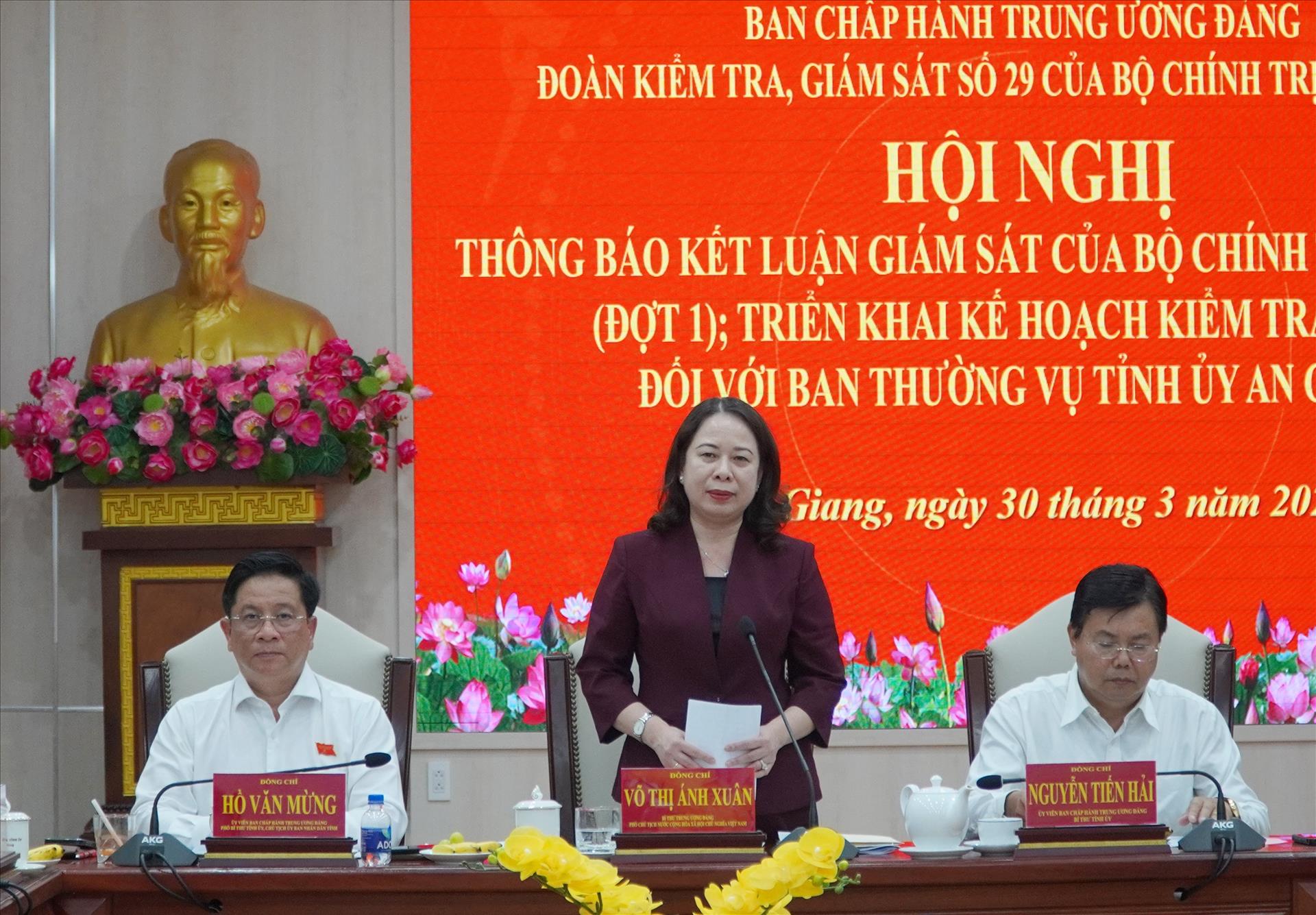 Phó Chủ tịch nước Võ Thị Ánh Xuân đề nghị, thời gian tới, Ban Thường vụ Tỉnh ủy An Giang quán triệt và thực hiện nghiêm túc Thông báo kết luận của Bộ Chính trị, Ban Bí thư; xây dựng kế hoạch thực hiện Kết luận giám sát đảm bảo rõ người, rõ việc, rõ trách nhiệm, rõ thời gian hoàn thành, phát huy những ưu điểm, kết quả đạt được; tập trung khắc phục các hạn chế, khuyết điểm đã được chỉ ra.