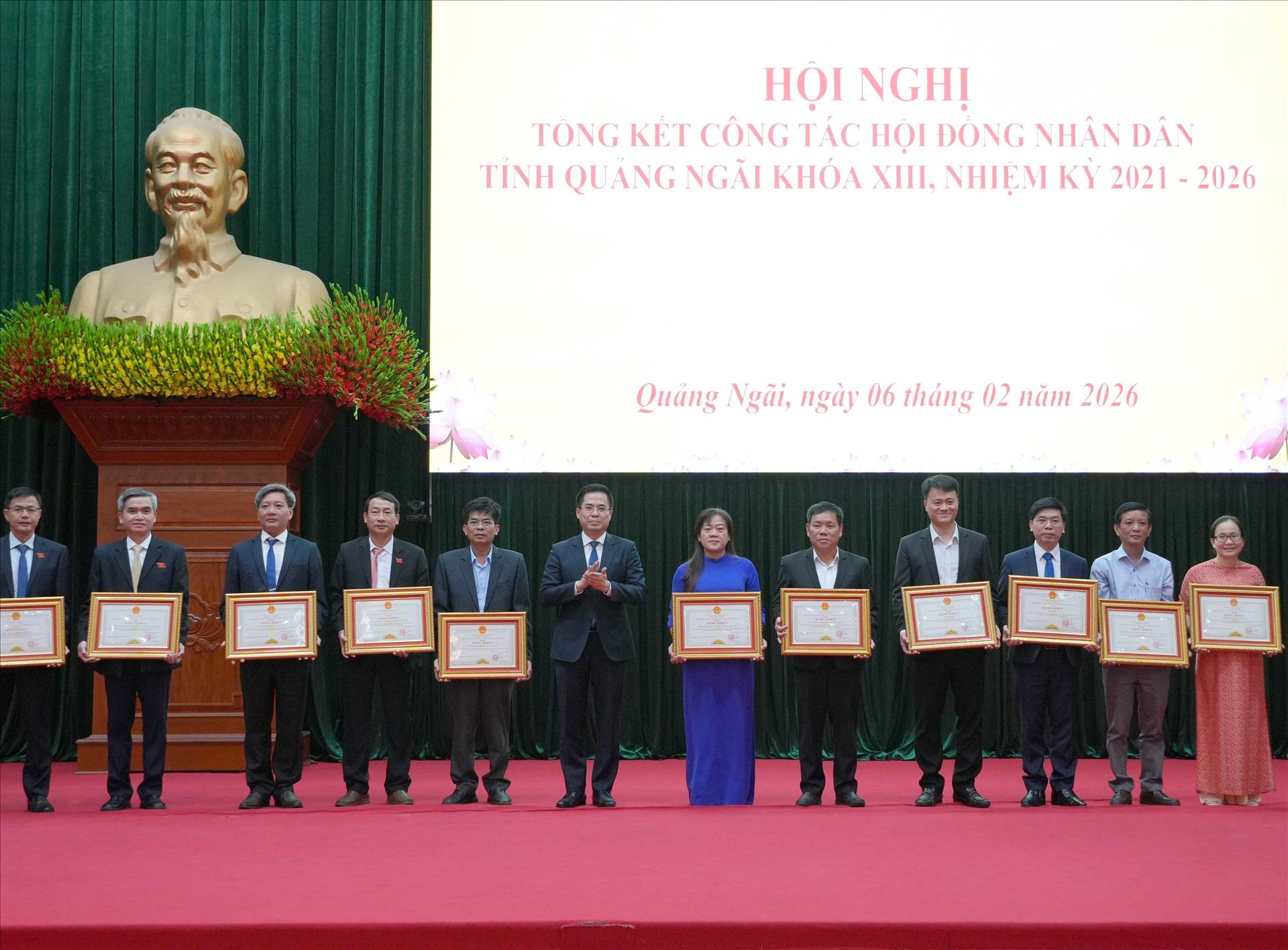 Tặng Bằng khen của Chủ tịch UBND tỉnh Quảng Ngãi cho 12 tập thể và 62 cá nhân có thành tích xuất sắc trong nhiệm kỳ 2021 - 2026. Ảnh: Dư Toán - TTXVN