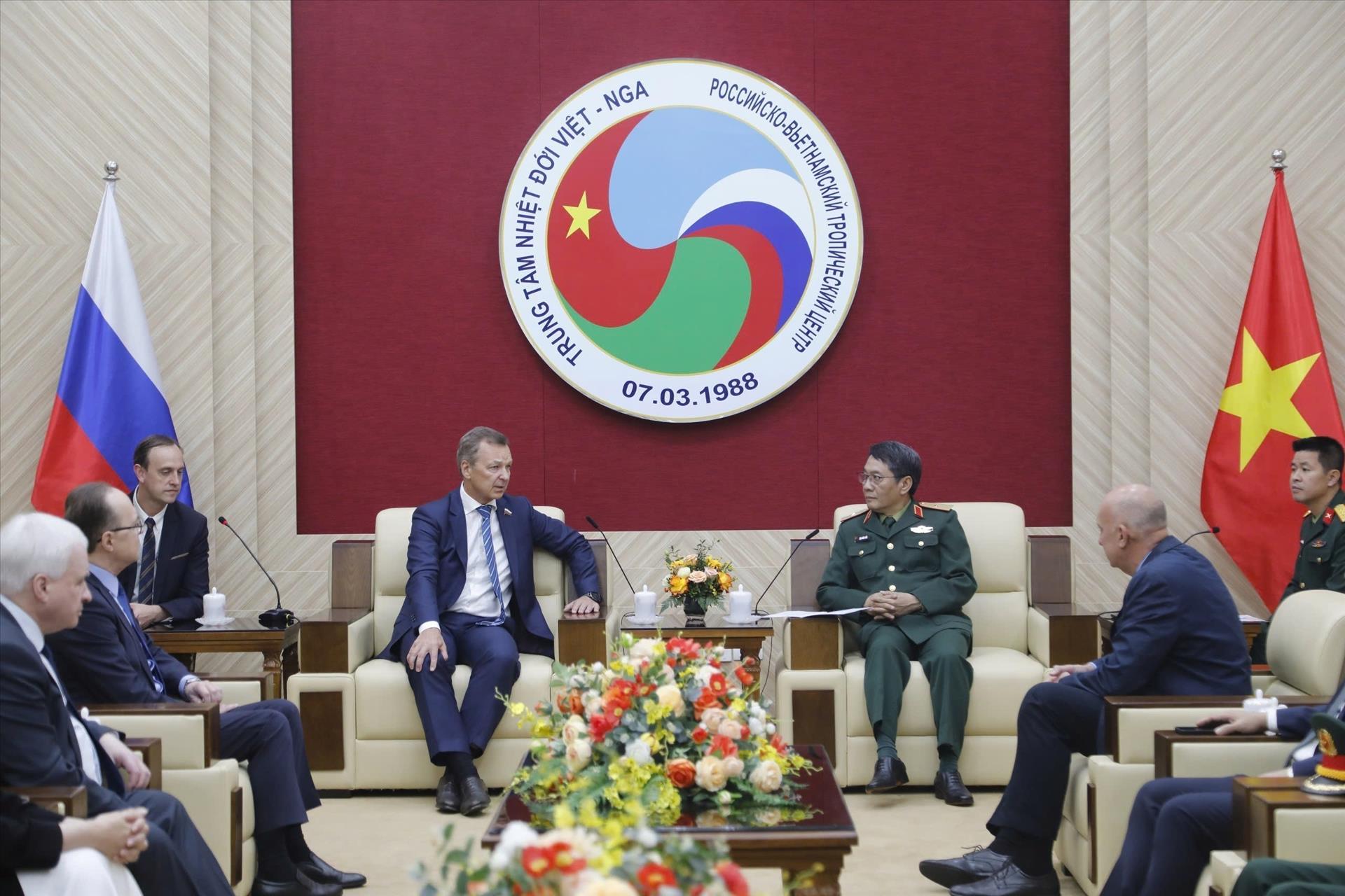Thiếu tướng Đặng Hồng Triển, Tổng giám đốc Trung tâm Nhiệt đới Việt - Nga tiếp Phó Chủ tịch thứ nhất Hội đồng Liên bang Quốc hội Liên bang Nga Andrey Vladimirovich Yatskin. Ảnh: TTXVN phát