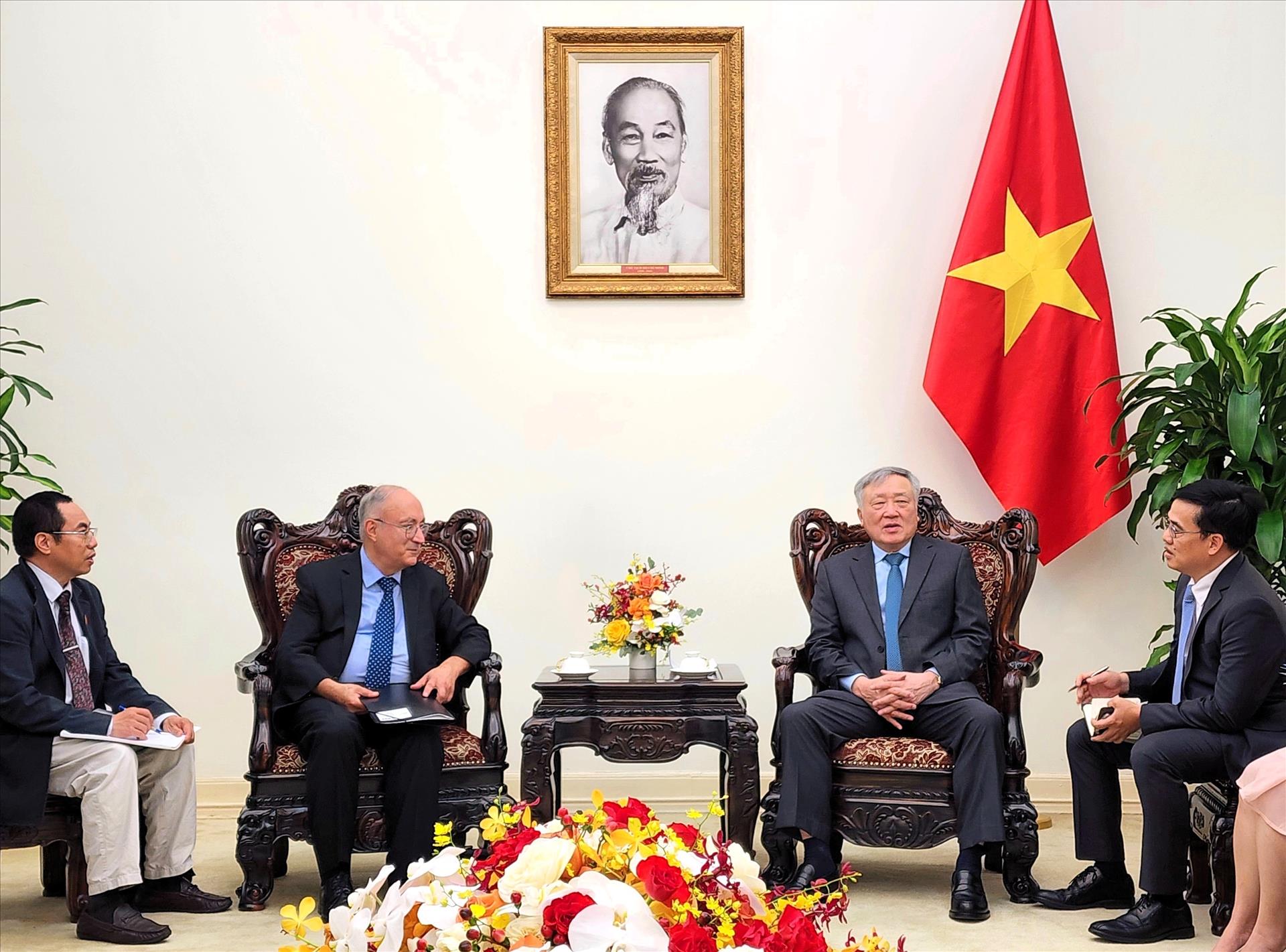 Phó Thủ tướng Thường trực Chính phủ Nguyễn Hòa Bình tiếp Chủ tịch Tổ chức Hỗ trợ đại học thế giới Đức Kambiz Ghawami. Ảnh: Chu Thanh Vân - TTXVN