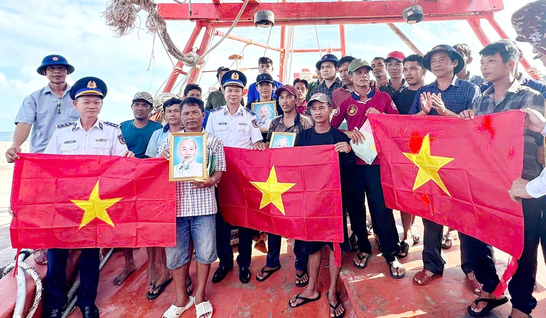 Thiếu tướng Nguyễn Văn Dũng, Bí thư Đảng ủy, Chính ủy Bộ Tư lệnh Vùng Cảnh sát biển 4, tặng cờ Tổ quốc, ảnh Bác Hồ cho ngư dân. Ảnh: TTXVN phát