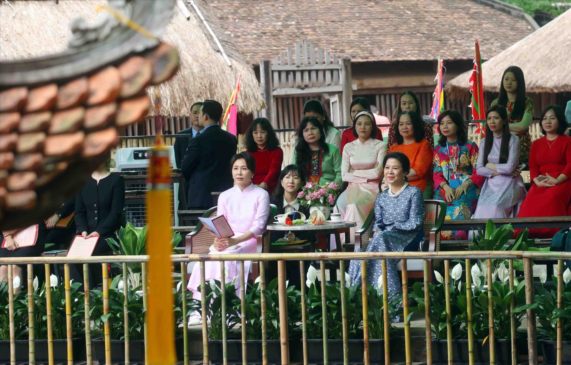 Phu nhân Tổng Bí thư, Chủ tịch nước Tô Lâm, bà Ngô Phương Ly và Phu nhân Tổng thống Hàn Quốc Lee Jae Myung, bà Kim Hae Kyung tham quan Bảo tàng Dân tộc học Việt Nam. Ảnh: Phạm Kiên - TTXVN