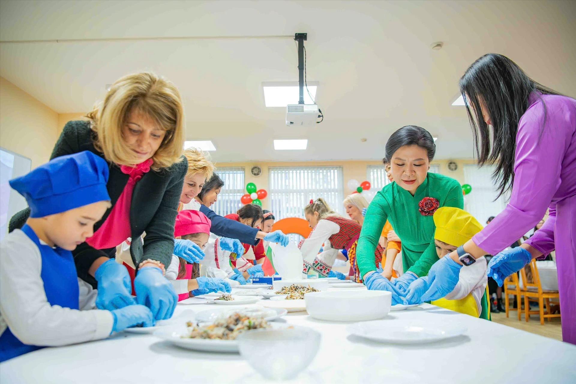Phu nhân Desislava Radeva cùng các em nhỏ hào hứng tập cuốn món nem Việt Nam – biểu tượng quen thuộc của ẩm thực Việt. Ảnh: TTXVN