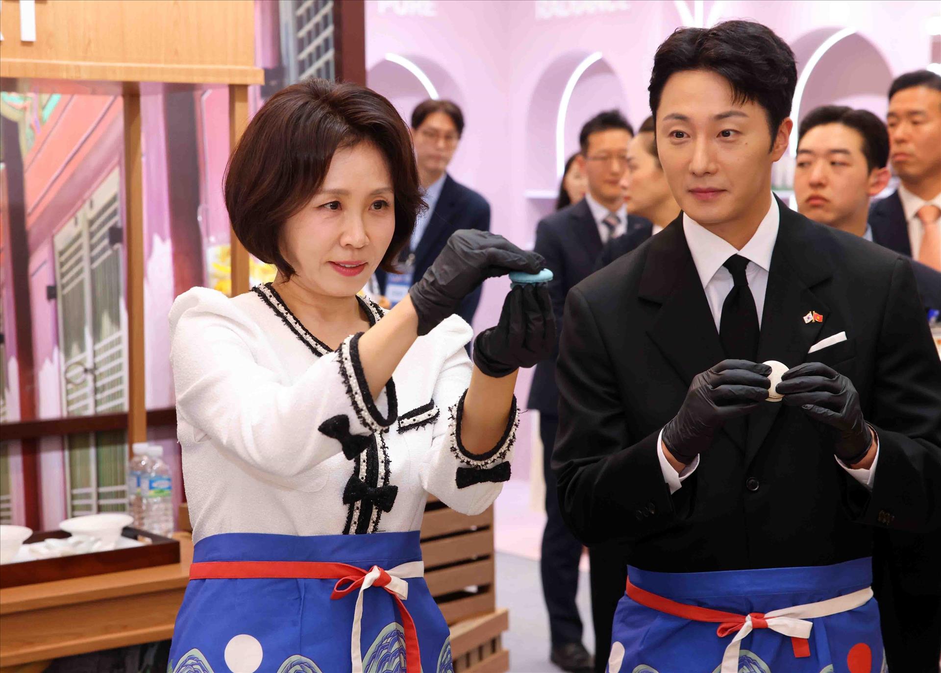 Phu nhân Tổng thống Hàn Quốc Lee Jae Myung, bà Kim Hae Kyung cùng các đại biểu trải nghiệm làm bánh macaron mè đen tại Lễ hội Văn hóa và Du lịch Hàn Quốc 2026 được tổ chức tại Hà Nội. Ảnh: Phạm Kiên - TTXVN
