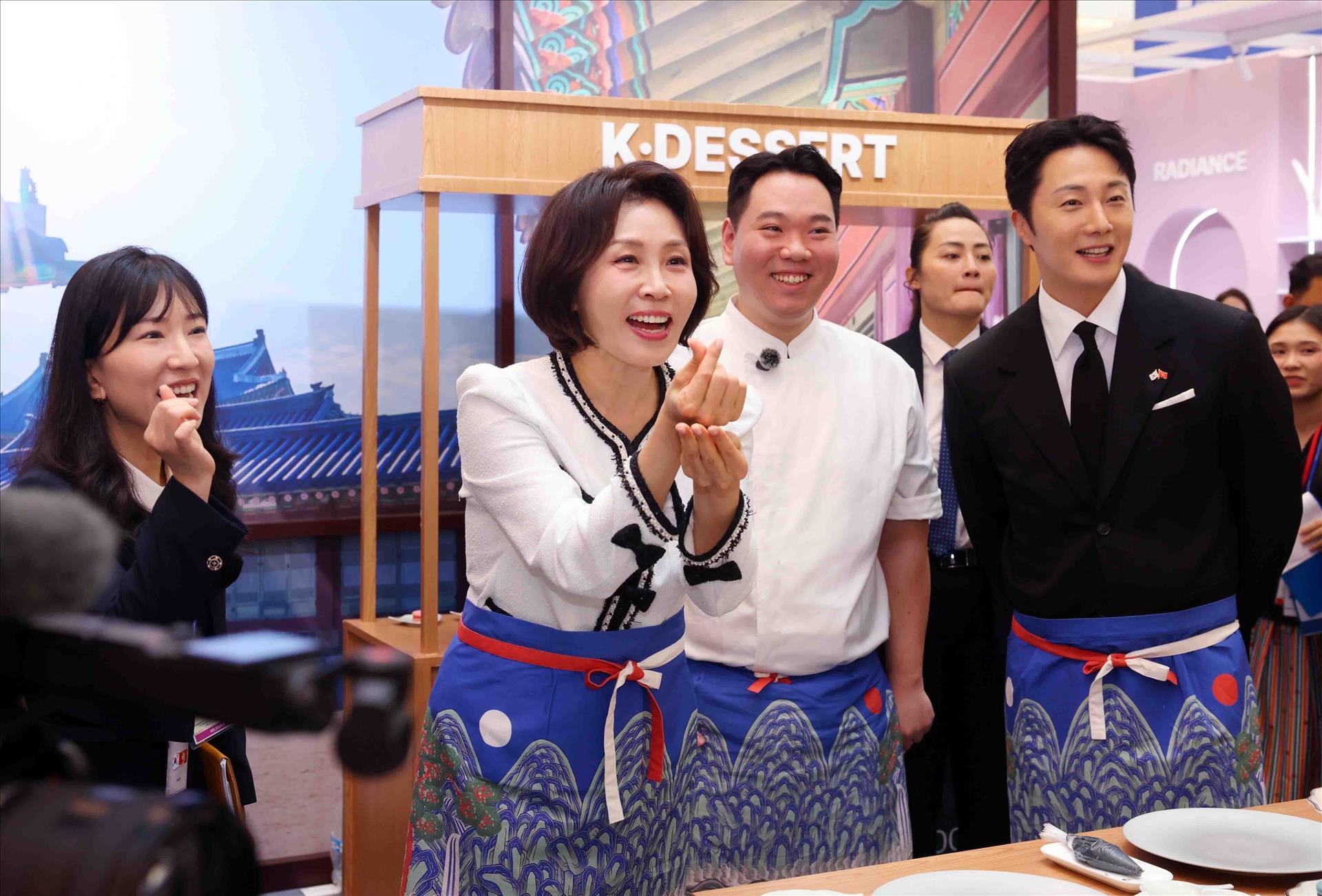 Phu nhân Tổng thống Hàn Quốc Lee Jae Myung, bà Kim Hae Kyung cùng các đại biểu trải nghiệm làm bánh macaron mè đen tại Lễ hội Văn hóa và Du lịch Hàn Quốc 2026 được tổ chức tại Hà Nội. Ảnh: Phạm Kiên - TTXVN Phu nhân Tổng thống Hàn Quốc Lee Jae Myung, bà Kim Hae Kyung tại Lễ hội Văn hóa và Du lịch Hàn Quốc 2026 tại Hà Nội. Ảnh: Phạm Kiên - TTXVN