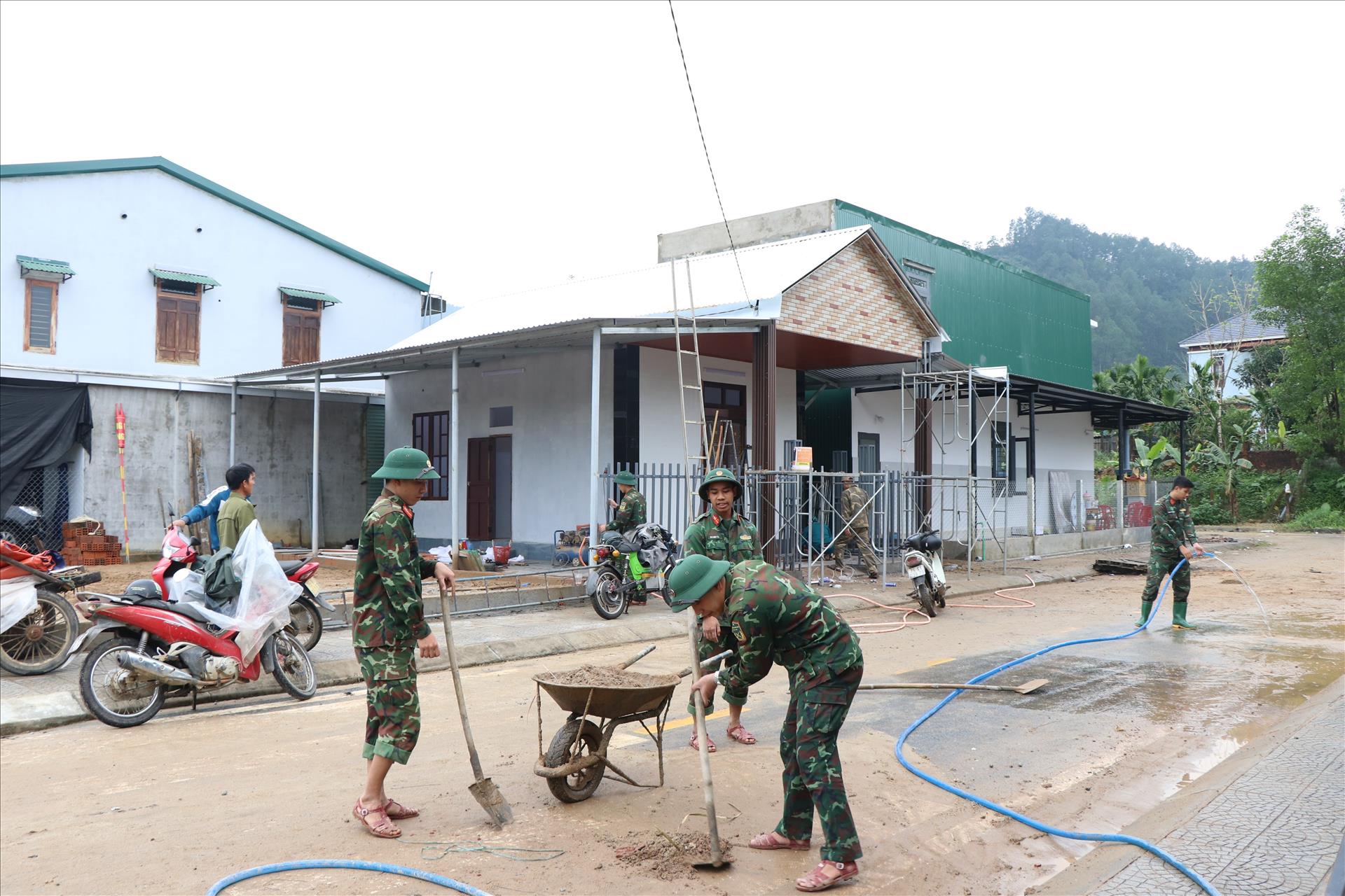 Các cán bộ, chiến sĩ, cùng người dân đang tập trung thần tốc, dồn toàn lực để sớm hoàn thành những ngôi nhà khang trang, giúp người dân có mái ấm đón Tết sum vầy, ấm no. Ảnh: Mai Trang - TTXVN