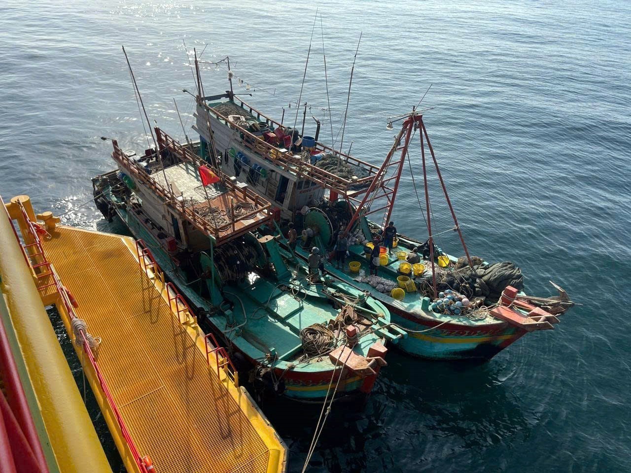 Hai tàu cá cặp mạn Nhà giàn DK1/10 để tổ Quân y cấp cứu cho ngư dân. Ảnh: TTXVN phát