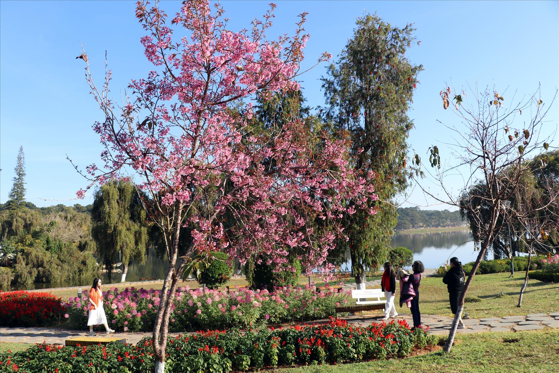 Du khách thưởng làm cây Mai anh đào nở sớm ven hồ Xuân hương. Ảnh: Chu Quốc Hùng -TTXVN