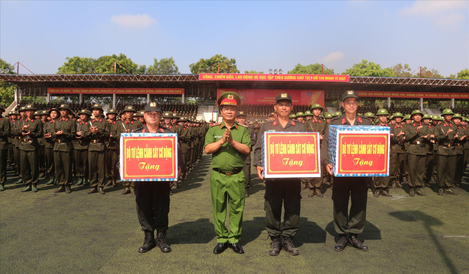 Thiếu tướng Phùng Văn Chiến, Phó Tư lệnh Cảnh sát Cơ động (Bộ Công an), tặng quà động viên giáo viên, cán bộ, học viên, chiến sĩ mới. Ảnh: Lê Xuân-TTXVN