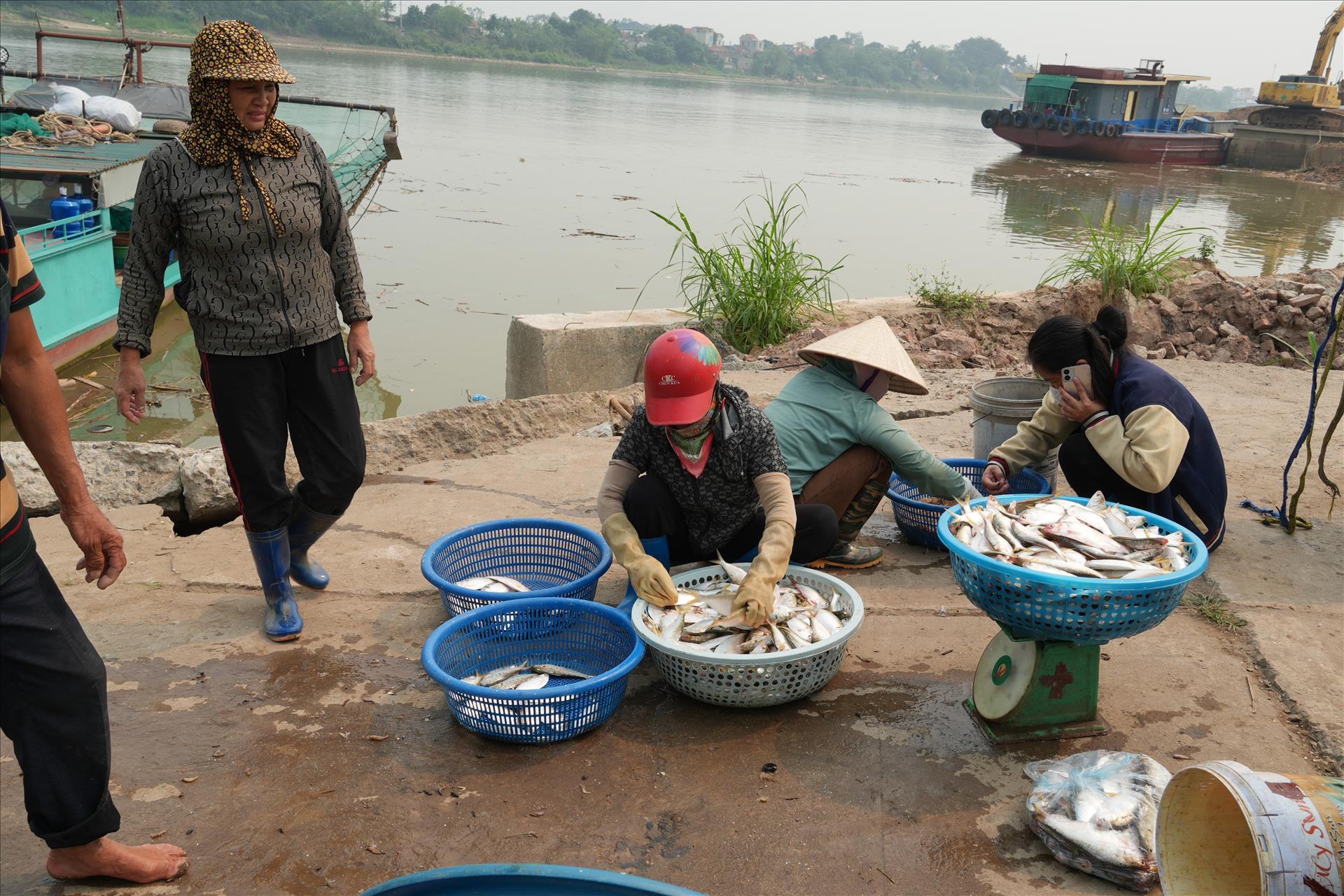 Sau khi đánh bắt, cá mòi được các tiểu thương thu mua ngay tại bến phà Vũ Điện, thuộc phường Phố Hiến (Hưng Yên). Ảnh Mạnh Khánh-TTXVN