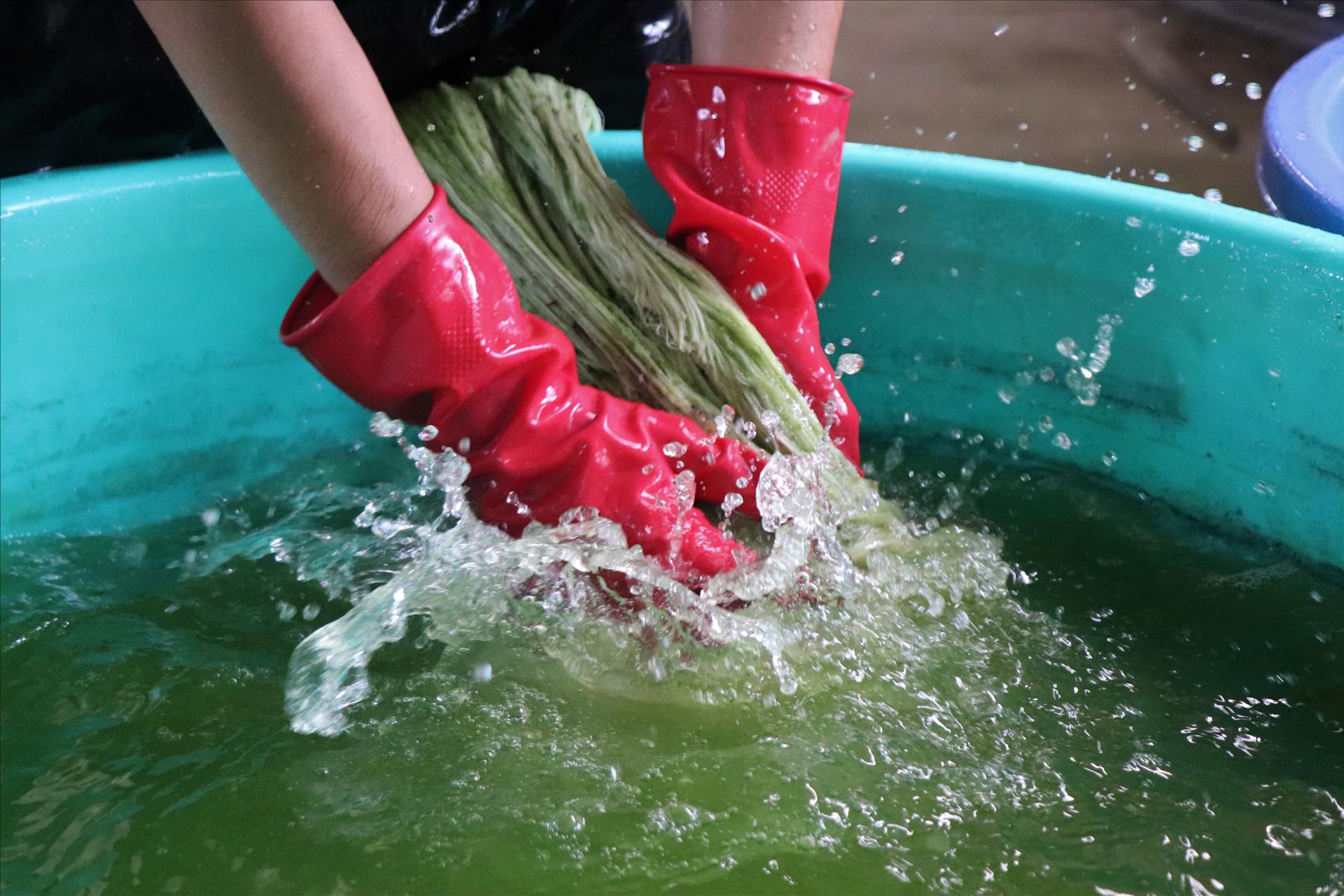 Sợi dứa (khóm) được rửa kĩ bằng nước sạch trước khi đưa vào máy ly tâm sấy khô. Ảnh: Thu Hiền/TTXVN