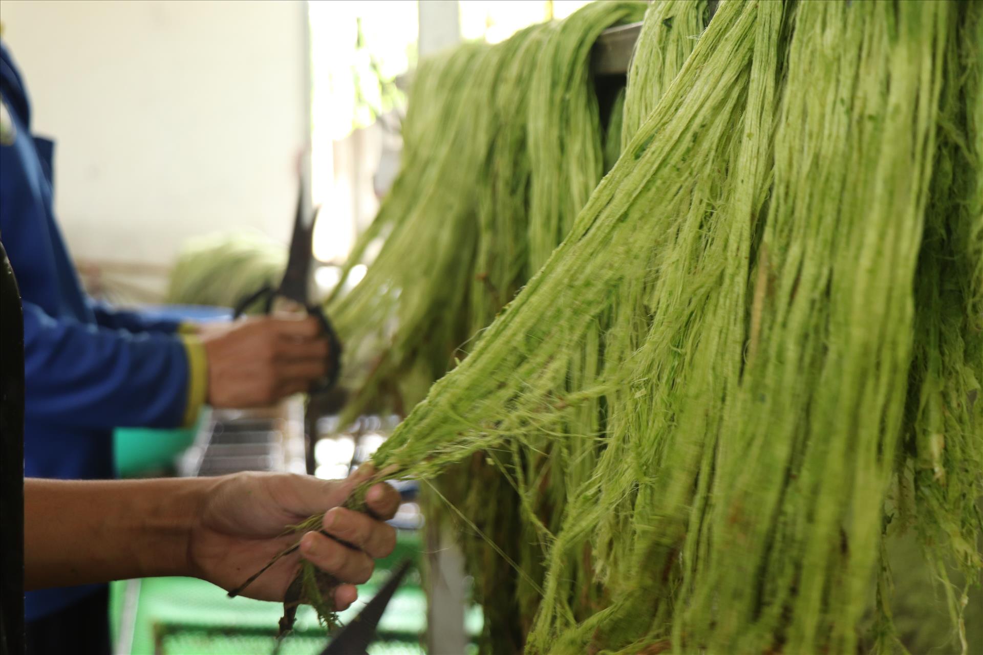 Mỗi kg sợi dứa (khóm) khô được làm ra từ 60kg lá khóm tươi 3 - 4 năm tuổi. Ảnh: Thu Hiền/TTXVN