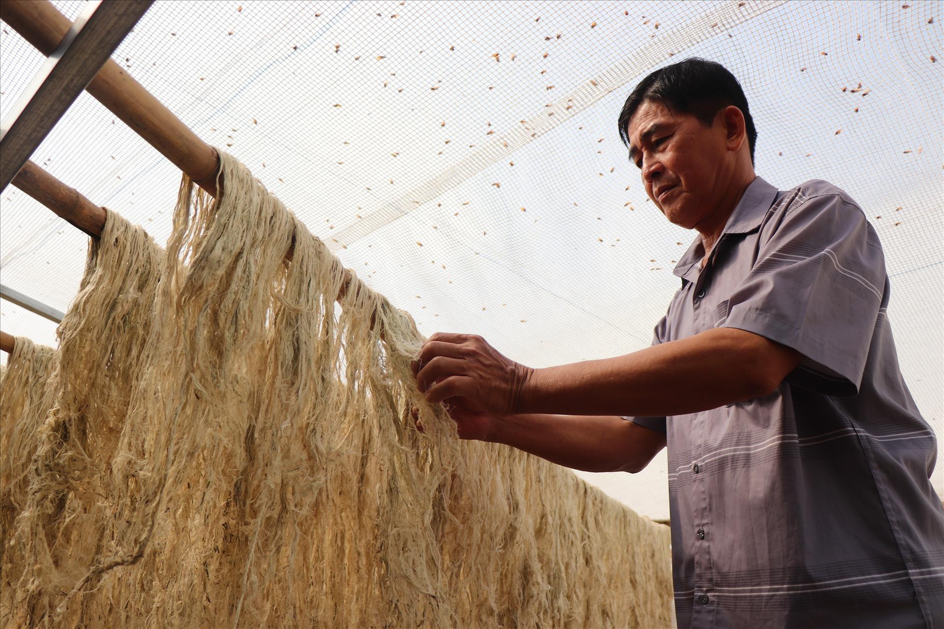 Phơi sợi dứa (khóm) tại Hợp tác xã Sản xuất, thương mại và dịch vụ Cần Thơ Farm. Ảnh: Thu Hiền/TTXVN