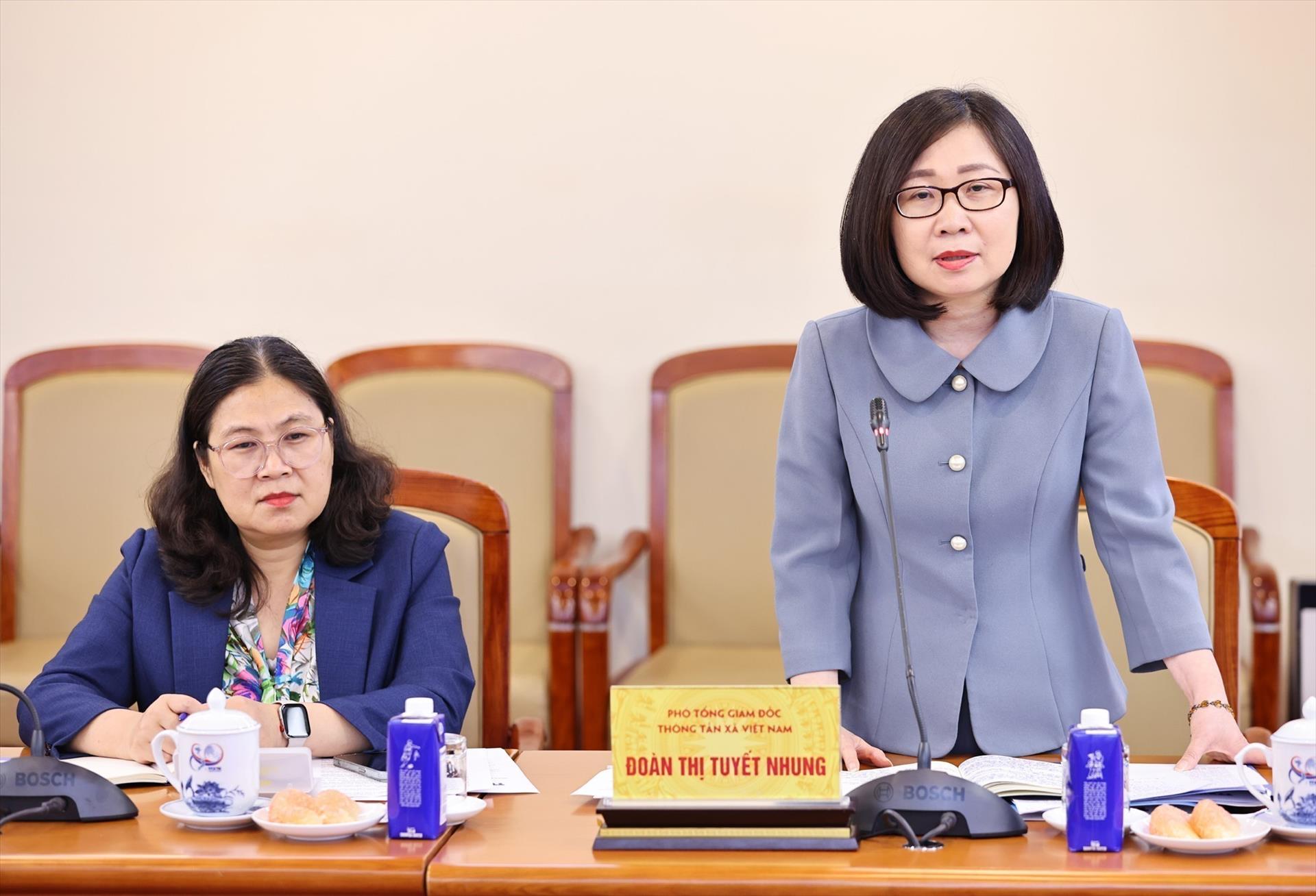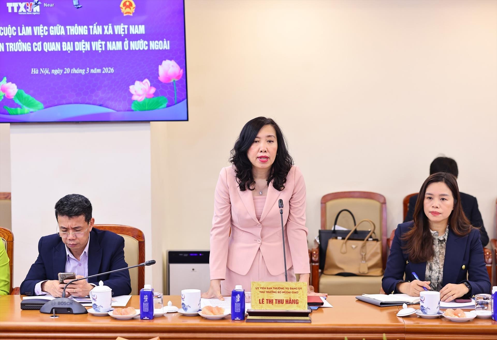 Phát biểu tại cuộc làm việc, Thứ trưởng Bộ Ngoại giao Lê Thị Thu Hằng đánh giá cao sự phối hợp giữa TTXVN và Bộ Ngoại giao trong thời gian qua, đồng thời khẳng định hai cơ quan đã duy trì mối quan hệ gắn bó, đồng hành chặt chẽ trên mặt trận thông tin đối ngoại.
