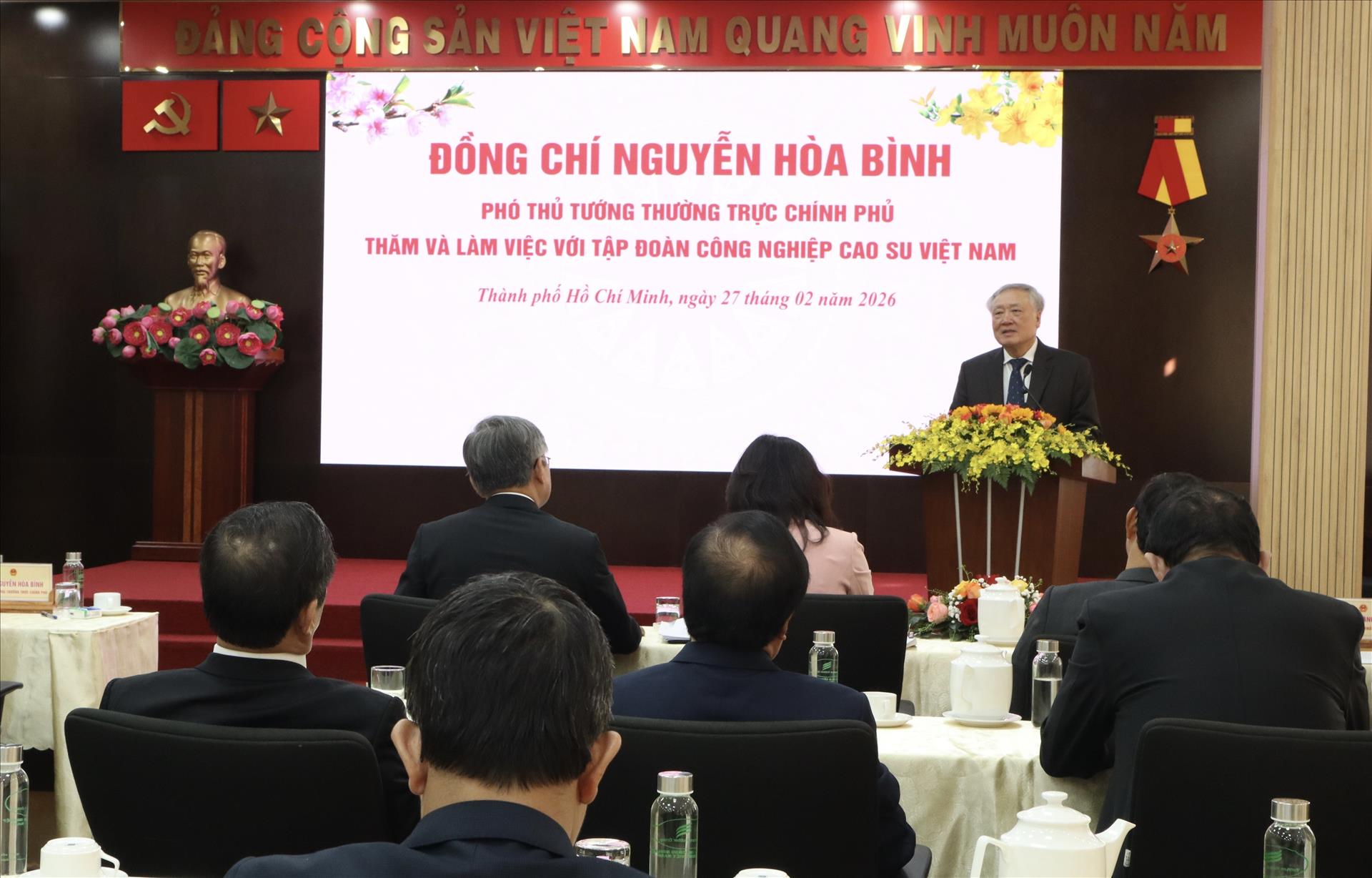 Trên cơ sở các định hướng lớn về phát triển kinh tế nhà nước, Phó Thủ tướng Thường trực Nguyễn Hòa Bình đề nghị Tập đoàn Công nghiệp Cao su Việt Nam quán triệt sâu sắc chủ trương của Đảng, chính sách, pháp luật của Nhà nước; tăng cường vai trò lãnh đạo của Đảng trong doanh nghiệp; giữ vững nguyên tắc tập trung dân chủ và đoàn kết nội bộ.