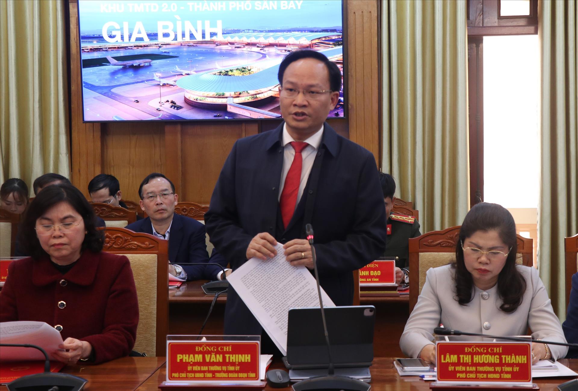 Báo cáo tại hội nghị, Phó Chủ tịch UBND tỉnh Bắc Ninh Phạm Văn Thịnh thông tin, Tỉnh ủy, UBND tỉnh Bắc Ninh xác định nhiệm vụ thực hiện bồi thường giải phóng mặt bằng dự án Cảng hàng không quốc tế Gia Bình và các dự án có liên quan là nhiệm vụ ưu tiên, trọng tâm, xuyên suốt trong lãnh đạo, chỉ đạo của Tỉnh ủy, UBND tỉnh giai đoạn hiện nay.