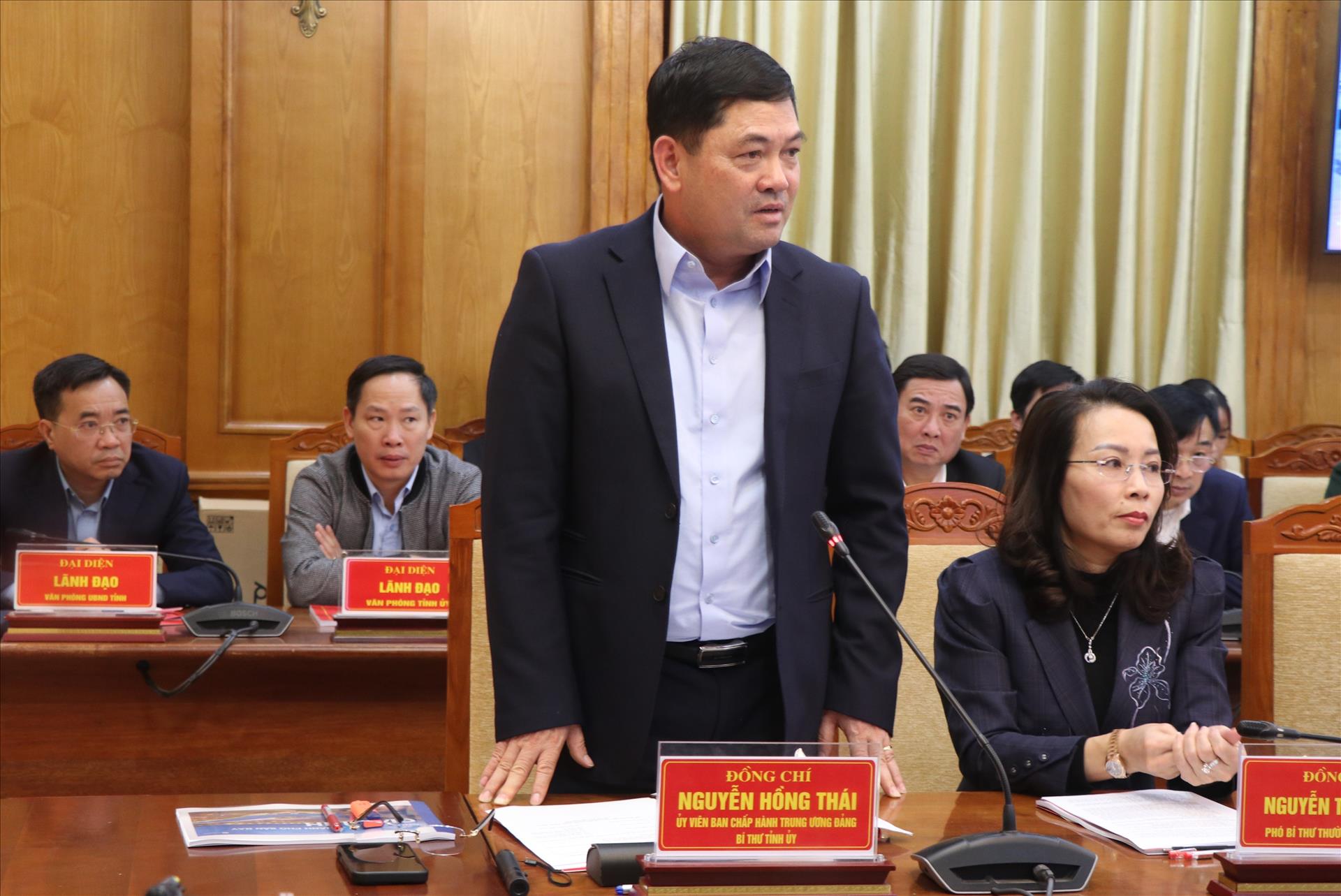 Bí thư Tỉnh ủy Bắc Ninh Nguyễn Hồng Thái phát biểu tại buổi làm việc. Ảnh: Thanh Thương - TTXVN