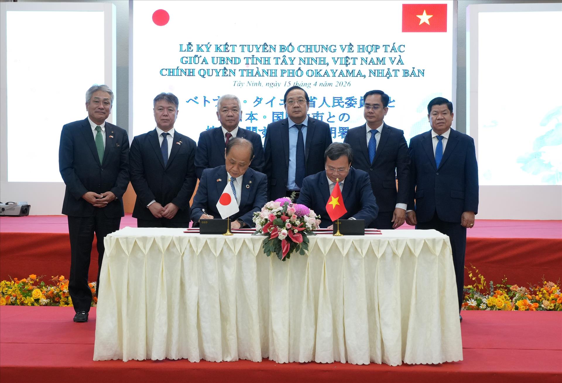 Chủ tịch UBND tỉnh Tây Ninh Lê Văn Hẳn và Thị trưởng thành phố Okayama, ông Masao Omori ký kết tuyên bố chung về hợp tác giữa UBND tỉnh Tây Ninh và chính quyền thành phố Okayama (Nhật Bản). Ảnh: Bùi Giang - TTXVN