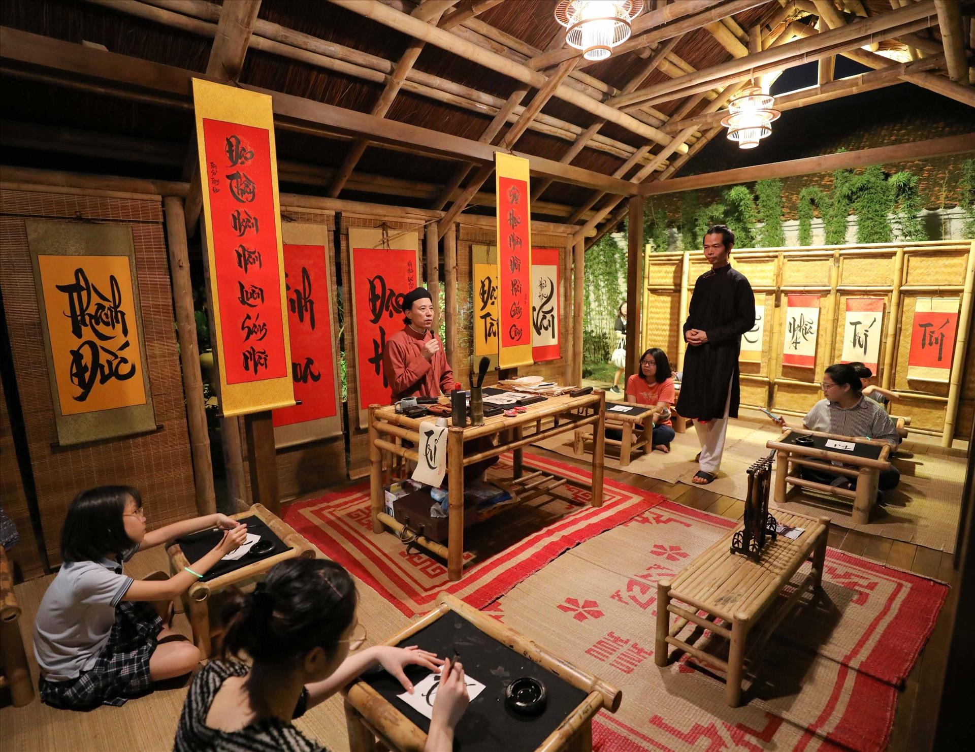 Du khách được trải nghiệm nhiều hoạt động ấn tượng tại Văn Miếu-Quốc Tử Giám. Ảnh: Thanh Tùng/TTXVN