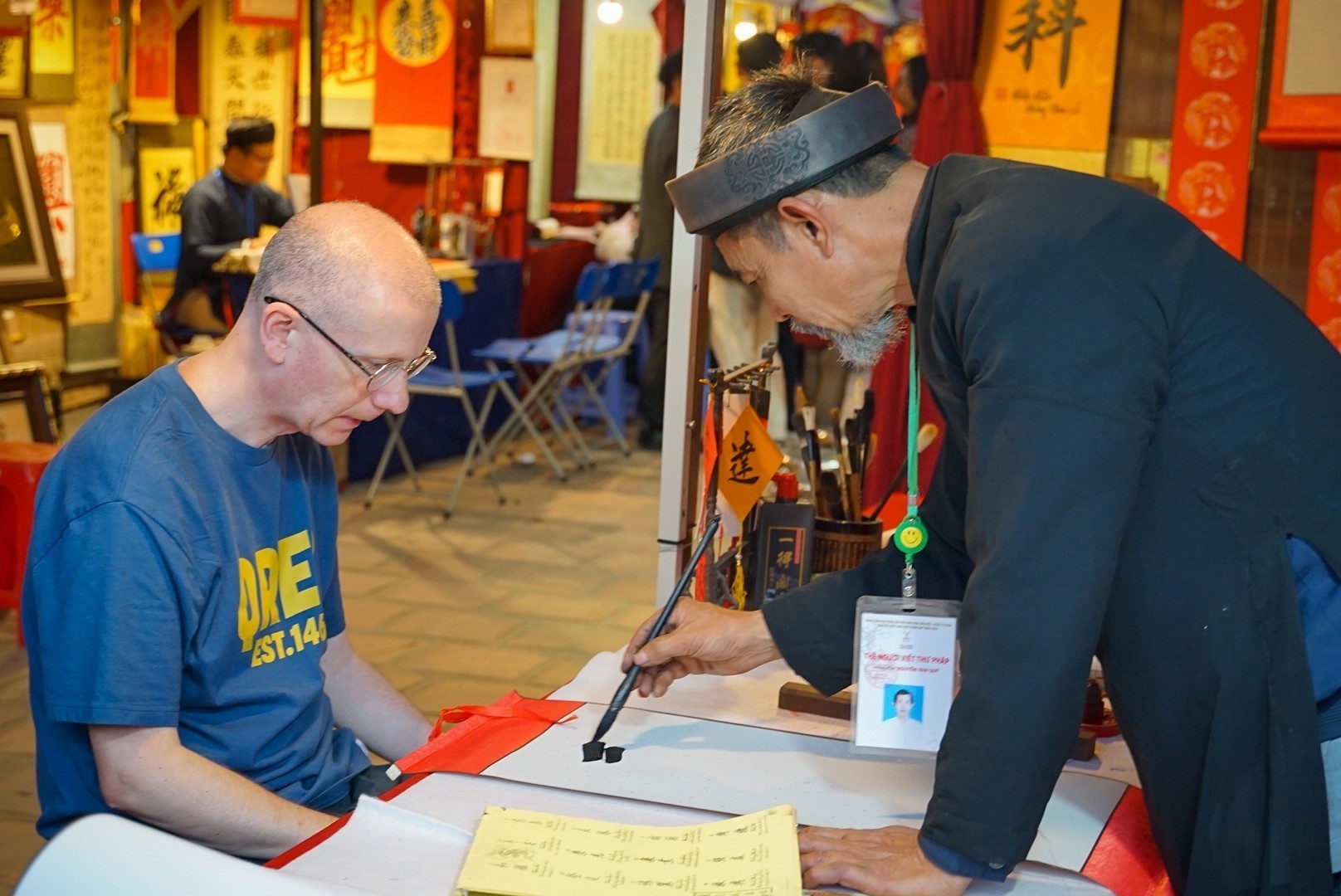 Một du khách nước ngoài chăm chú từng nét bút của ông đồ. Ảnh: Khánh Hoà/ TTXVN