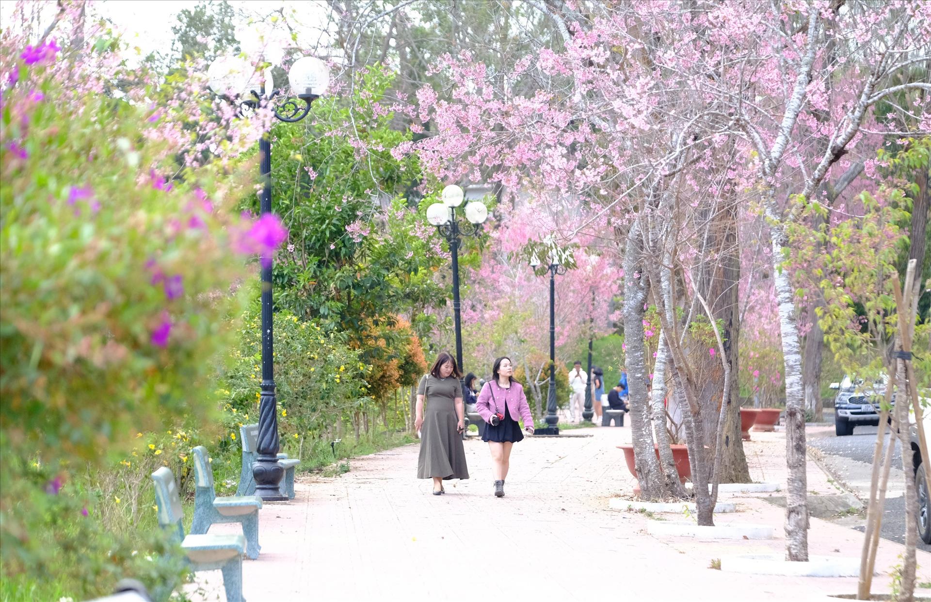 Tương tự, có dịp dẫn học trò đi ngoại khóa trước khi bước vào kỳ nghỉ Tết kéo dài, du khách Trần Thanh Hải (giáo viên cấp 3 tại Thành phố Hồ Chí Minh) cũng kịp đến tham quan giảng đường trường Đại học Đà Lạt. Không chỉ vì mùa mai anh đào mà nơi này còn có khuôn viên rộng rãi hàng chục hecta, cùng với đó là những khối nhà giảng đường mang nét kiến trúc đặc trưng, xen lẫn quần thể rừng thông, cây cổ thụ rất riêng của Đà Lạt. Chị Thanh Hải cho biết: Mình dẫn các bạn học sinh đến đây vừa để tham quan, vừa giúp các em tìm hiểu thêm về giảng đường đại học, nơi các em có thể viết tiếp ước mơ sau khi rời ghế trường phổ thông.