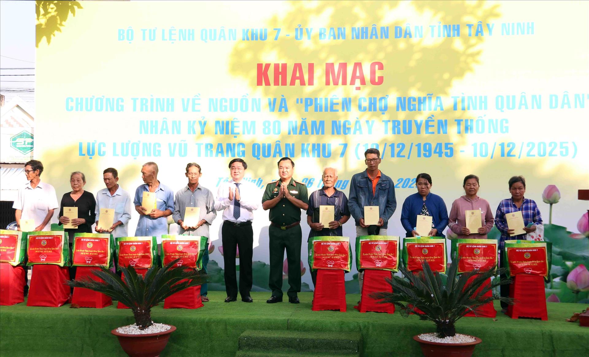 Thiếu tướng Trần Vinh Ngọc, Chính ủy Quân khu 7 cùng đại diện lãnh đạo tỉnh Tây Ninh tặng quà cho người dân xã Đức Huệ. Ảnh: Xuân Khu-TTXVN