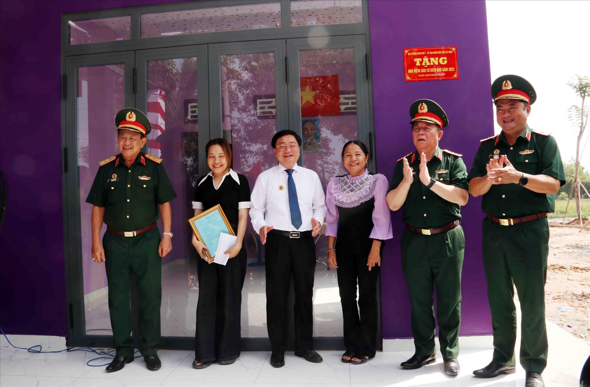Thượng tướng Võ Minh Lương, Thứ trưởng Bộ Quốc phòng và Thiếu tướng Trần Vinh Ngọc, Chính ủy Quân khu 7 tặng quà cho người dân được nhận nhà mới trong dự án Điểm dân cư liền kề chốt dân quân biên giới tỉnh Tây Ninh. Ảnh: Xuân Khu-TTXVN