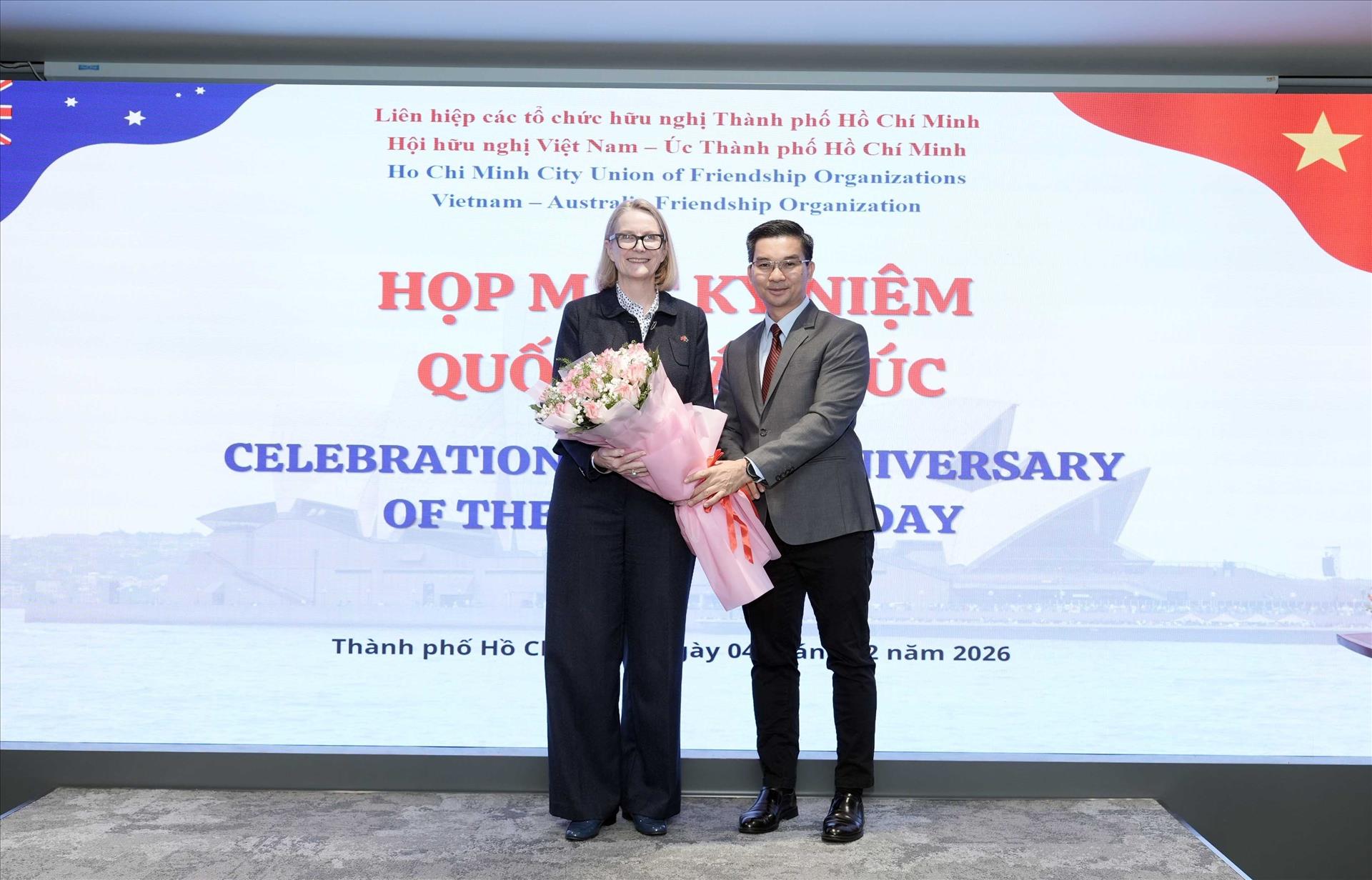 Ông Nguyễn Quang Trung, Phó Chủ tịch Hội hữu nghị Việt Nam - Australia TP. Hồ Chí Minh, tặng hoa chúc mừng bà Tổng lãnh sự Australia tại TP. Hồ Chí Minh. Ảnh: Xuân Khu - TTXVN