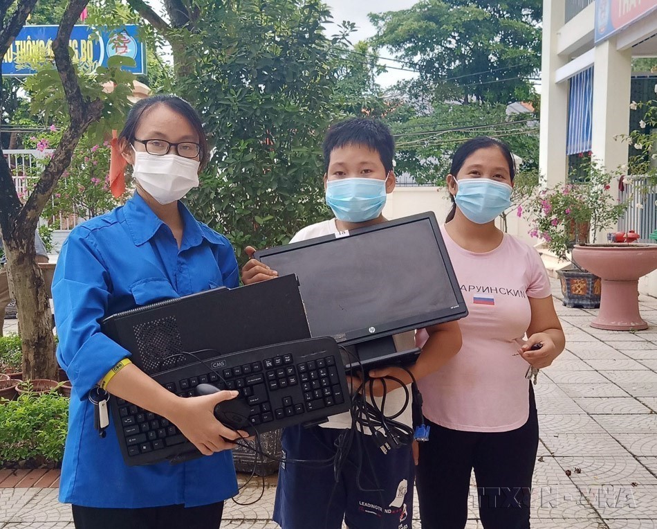 Để khắc phục tình trạng học sinh có hoàn cảnh khó khăn, không có thiết bị để học trực tuyến trong thời gian phòng, chống dịch COVID-19, nhiều trường học tại Hà Nội đã cho học sinh mượn máy tính của trường học trực tuyến. Ảnh: TTXVN phát