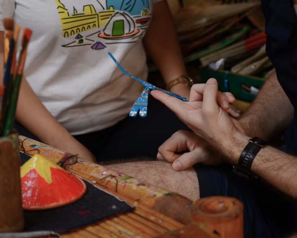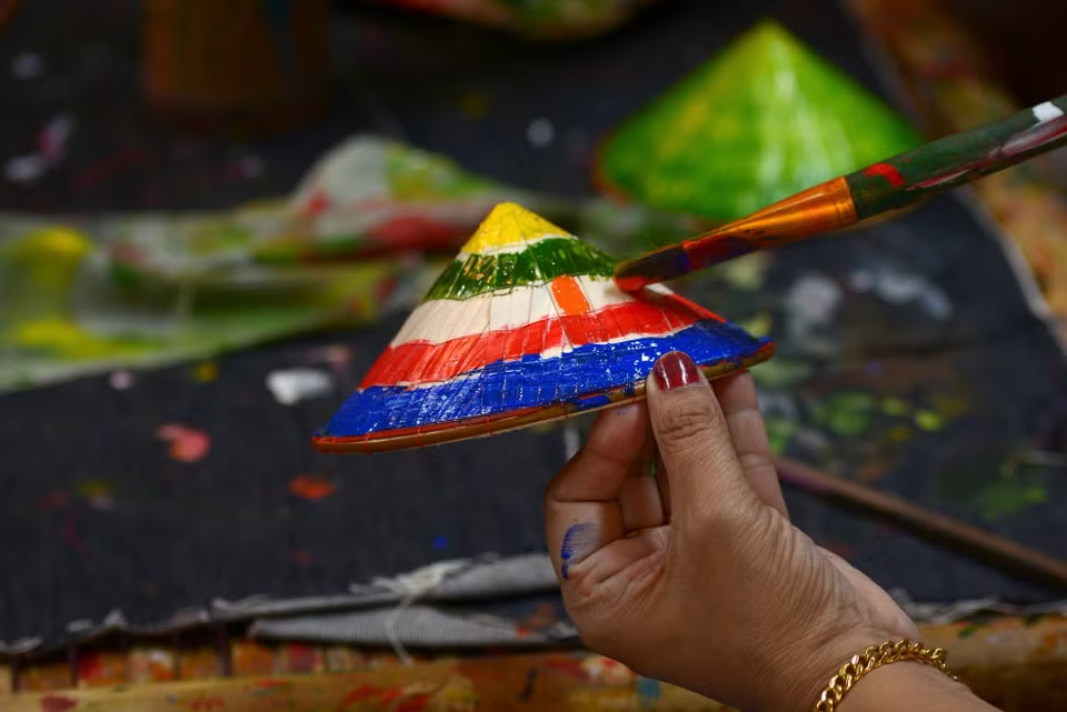 Du khách thực hiện pha màu để tạo nên những "tác phẩm nón lá" cho riêng mình. Sau thời gian ngắn ngồi bên khung nón, chậm rãi xếp từng lớp lá, du khách đã có thể "chạm" vào một phần chân thật nhất của văn hóa Việt Nam. Ảnh: Mai Huyền/Vietnam+