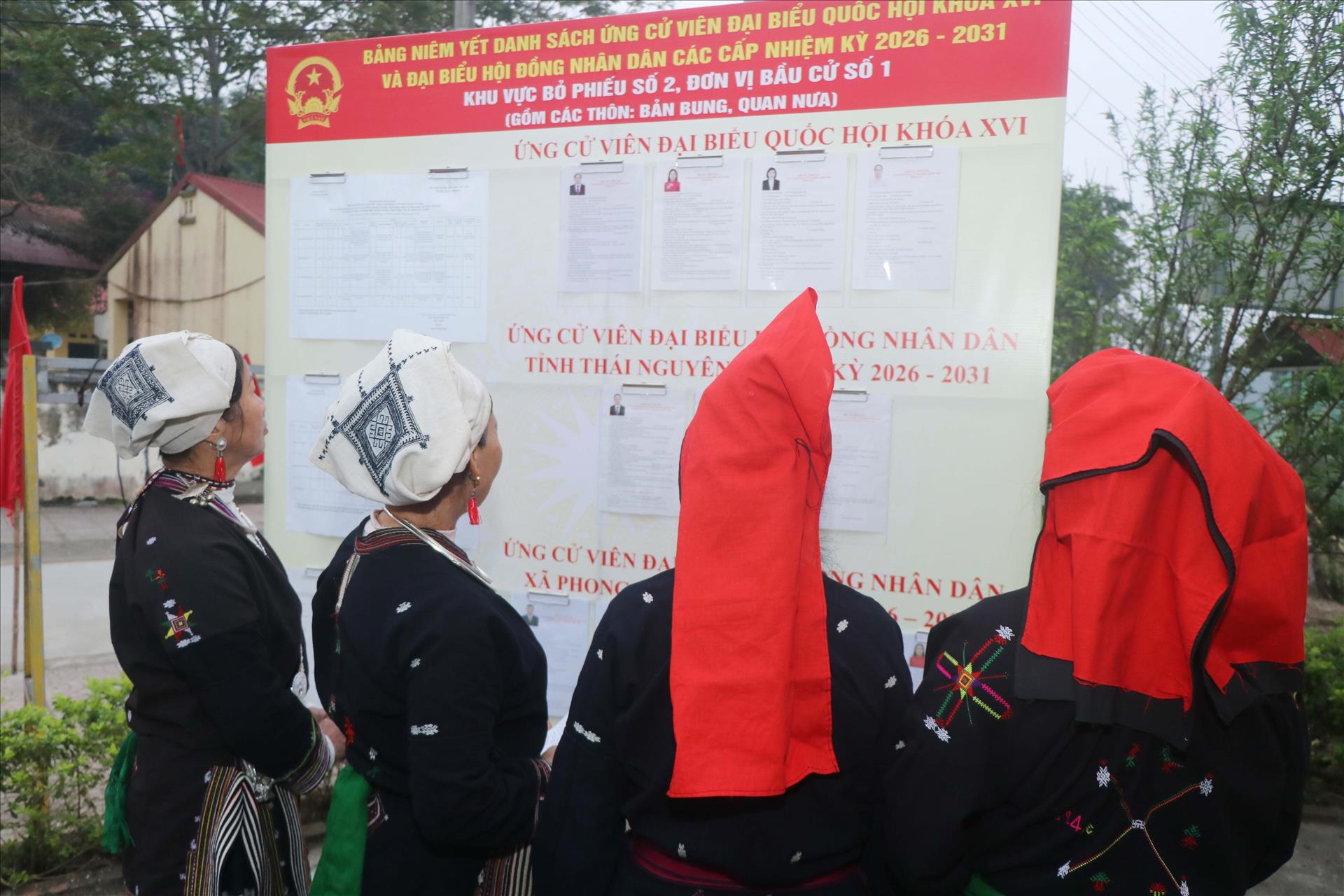 Người dân thôn Bản Bung tập trung xem danh sách người ứng cử. Ảnh: Vũ Hoàng Giang - TTXVN
